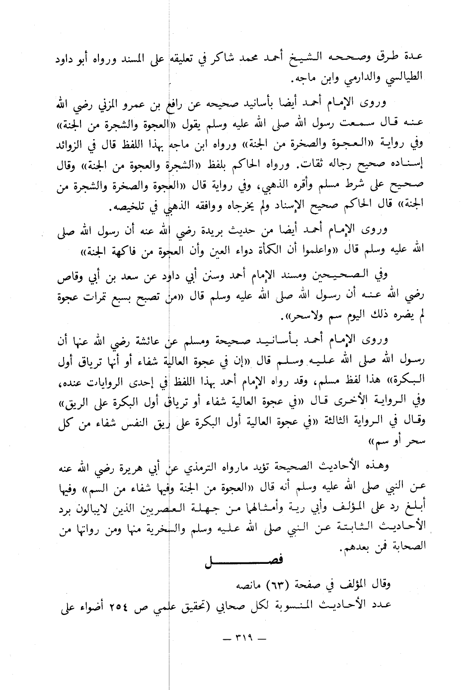 وهذه الأحاديث الصحيحة تؤيد ما رواه الترمذي عن أبي هريرة رضي الله عنه عن النبي صلى الله عليه وسلم أنه قال «العجوة من الجنة وفيها شفاء من السم» وفيها أبلغ رد على المؤلف وأبي رية وأمثالهما من جهلة العصريين الذين لا يبالون برد الأحاديث الثابتة عن النبي صلى الله عليه وسلم والسخرية منها ومن رواتها من الصحابة فمن بعدهم.