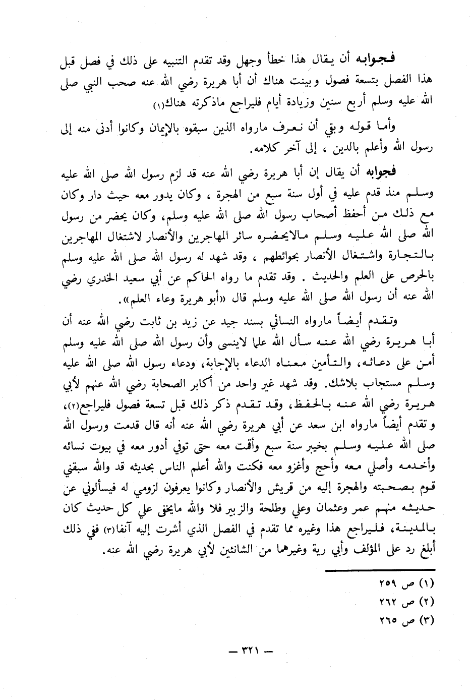 فجوابه أن يقال هذا خطأ وجهل وقد تقدم التنبيه على ذلك في فصل قبل هذا الفصل بتسعة فصور وبينت هناك أن أبا هريرة رضي الله عنه صحب النبي صلى الله عليه وسلم أربع سنين وزيادة أيام فليراجع ما ذكرته هناك (¬1).