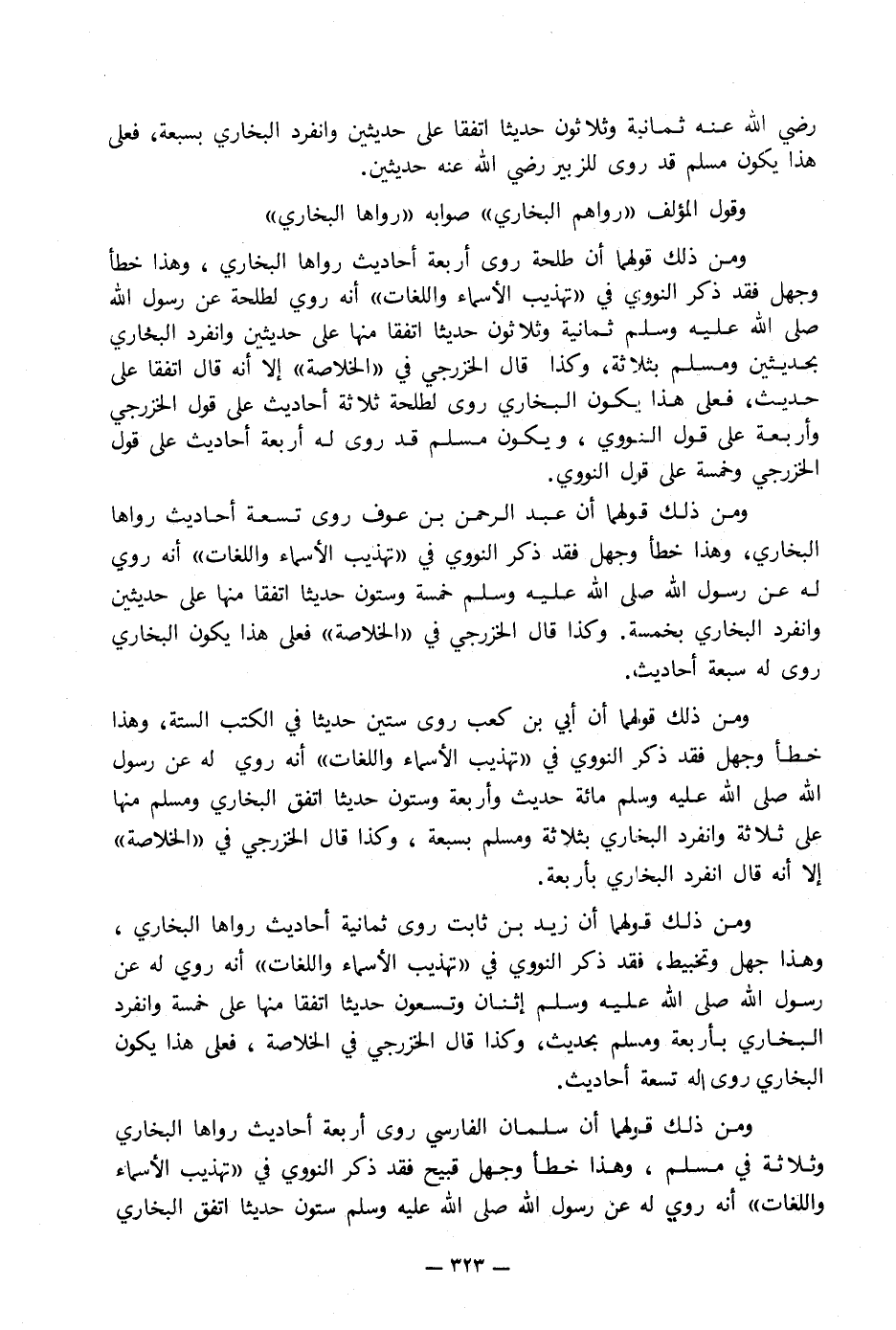 ومن ذلك قولهما أن طلحة روى أربعة أحاديث رواها البخاري, وهذا خطأ وجهل فقد ذكر النووي في «تهذيب الأسماء واللغات» أنه روي لطلحة عن رسول الله صلى الله عليه وسلم ثمانية وثلاثون حديثا اتفقا منها على حديثين وانفرد البخاري بحديثين ومسلم بثلاثة, وكذا قال الخزرجي في «الخلاصة» إلا أنه قال اتفقا على حديث, فعلى هذا يكون البخاري روى لطلحة ثلاثة أحاديث على قول الخزرجي وأربعة على قول النووي, ويكون مسلم قد روى له أربعة أحاديث على قول الخزرجي وخمسة على قول النووي.