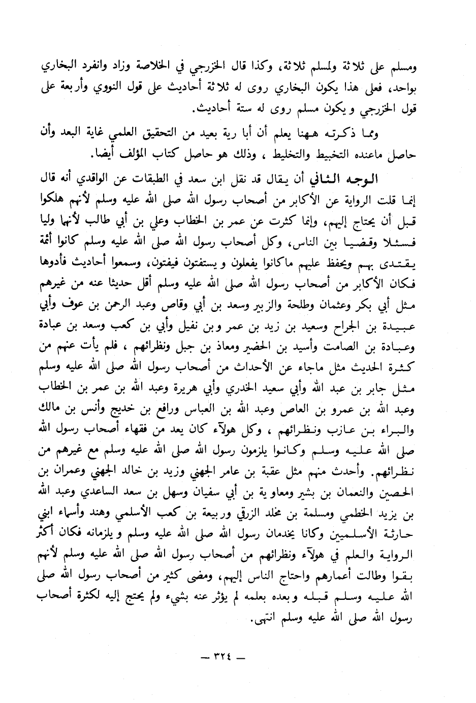 الوجه الثاني أن يقال قد نقل ابن سعد في الطبقات عن الواقدي أنه قال إنما قلت الرواية عن الأكابر من أصحاب رسول الله صلى الله عليه وسلم لأنهم هلكوا قبل أن يحتاج إليهم, وإنما كثرت عن عمر بن الخطاب وعلي بن أبي طالب لأنهما وليا فسئلا وقضيا بين الناس, وكل أصحاب رسول الله صلى الله عليه وسلم كانوا أئمة يقتدى بهم ويحفظ عليهم ما كانوا يفعلون ويستفتون فيفتون, وسمعوا أحاديث فأدوها فكان الأكابر من أصحاب رسول الله صلى الله عليه وسلم أقل حديثا عنه من غيرهم مثل أبي بكر وعثمان وطلحة والزبير وسعد بن أبي وقاص وعبد الرحمن بن عوف وأبي عبيدة بن الجراح وسعيد بن زيد بن عمرو بن نفيل وأبي بن كعب وسعد بن عبادة وعبادة بن الصامت وأسيد بن الحضير ومعاذ بن جبل ونظرائهم, فلم يأت عنهم من كثرة الحديث مثل ما جاء عن الأحداث من أصحاب رسول الله صلى الله عليه وسلم مثل جابر بن عبد الله وأبي سعيد الخدري وأبي هريرة وعبد الله بن عمر بن الخطاب وعبد الله بن عمرو بن العاص وعبد الله بن العباس ورافع بن خديج وأنس بن مالك والبراء بن عازب ونظرائهم, وكل هؤلاء كان يعد من فقهاء أصحاب رسول الله صلى الله عليه وسلم وكانوا يلزمون رسول الله صلى الله عليه وسلم مع غيرهم من نظرائهم. وأحدث منهم مثل عقبة بن عامر الجهني وزيد بن خالد الجهني وعمران بن الحصين والنعمان بن بشير ومعاوية بن أبي سفيان وسهل بن سعد الساعدي وعبد الله بن يزيد الخطمي ومسلمة بن مخلد الزرقي وربيعة بن كعب الأسلمي وهند وأسماء ابني حارثة الأسلميين وكانا يخدمان رسول الله صلى الله عليه وسلم ويلزمانه فكان أكثر الرواية والعلم في هؤلاء ونظرائهم من أصحاب رسول الله صلى الله عليه وسلم لأنهم بقوا وطالت أعمارهم واحتاج الناس إليهم, ومضى كثير من أصحاب رسول الله صلى الله عليه وسلم قبله وبعده بعلمه لم يؤثر عنه بشيء ولم يحتج إليه لكثرة أصحاب رسول الله صلى الله عليه وسلم انتهى.
