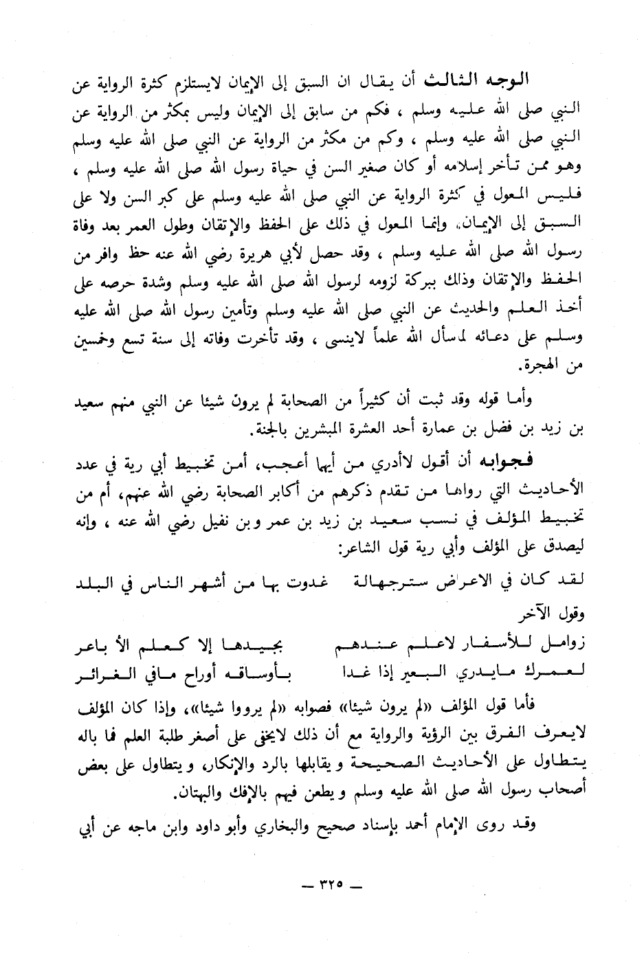 الوجه الثالث أن يقال إن السبق إلى الإِيمان لا يستلزم كثرة الرواية عن النبي صلى الله عليه وسلم, فكم من سابق إلى الإِيمان وليس بمكثر من الرواية عن النبي صلى الله عليه وسلم, وكم من مكثر من الرواية عن النبي صلى الله عليه وسلم وهو ممن تأخر إسلامه أو كان صغير السن في حياة رسول الله صلى الله عليه وسلم, فليس المعول في كثرة الرواية عن النبي صلى الله عليه وسلم على كبر السن ولا على السبق إلى الإِيمان, وإنما المعول في ذلك على الحفظ والإِتقان وطول العمر بعد وفاة رسول الله صلى الله عليه وسلم, وقد حصل لأبي هريرة رضي الله عنه حظ وافر من الحفظ والإِتقان وذلك ببركة لزومه لرسول الله صلى الله عليه وسلم وشدة حرصه على أخذ العلم والحديث عن النبي صلى الله عليه وسلم وتأمين رسول الله صلى الله عليه وسلم على دعائه لما سأل الله علماً لا ينسى. وقد تأخرت وفاته إلى سنة تسع وخمسين من الهجرة.