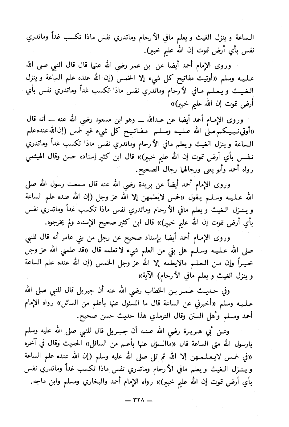 وروى الإِمام أحمد أيضا عن عبد الله - وهو ابن مسعود رضي الله عنه - أنه قال «أوتي نبيكم صلى الله عليه وسلم مفاتيح كل شيء غير خمس (إن الله عنده علم الساعة وينزل الغيث ويعلم ما في الأرحام وما تدري نفس ماذا تكسب غداً وما تدري نفس بأي أرض تموت إن الله عليم خبير)» قال ابن كثير إسناده حسن وقال الهيثمي رواه أحمد وأبو يعلى ورجالهما رجال الصحيح.