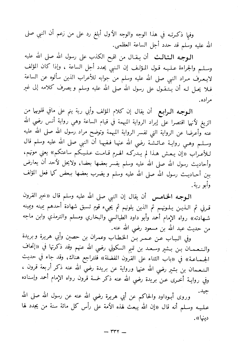 الوجه الرابع أن يقال إن كلام المؤلف وأبي رية ينم على ما في قلوبهما من الزيغ لأنهما اقتصرا على إيراد الرواية المبهمة في قيام الساعة وهي رواية أنس رضي الله عنه وأعرضا عن الرواية التي تفسر الرواية المبهمة وتوضح مراد رسول الله صلى الله عليه وسلم وهي رواية عائشة رضي الله عنها ففيها أن النبي صلى الله عليه وسلم قال للأعراب «إن يعش هذا لم يدركه الهرم قامت عليكم ساعتكم» يعني موتهم, وأحاديث رسول الله صلى الله عليه وسلم يفسر بعضها بعضا, ولا يحل لأحد أن يعارض بين أحاديث رسول الله صلى الله عليه وسلم ويضرب بعضها ببعض كما فعل المؤلف وأبو رية.