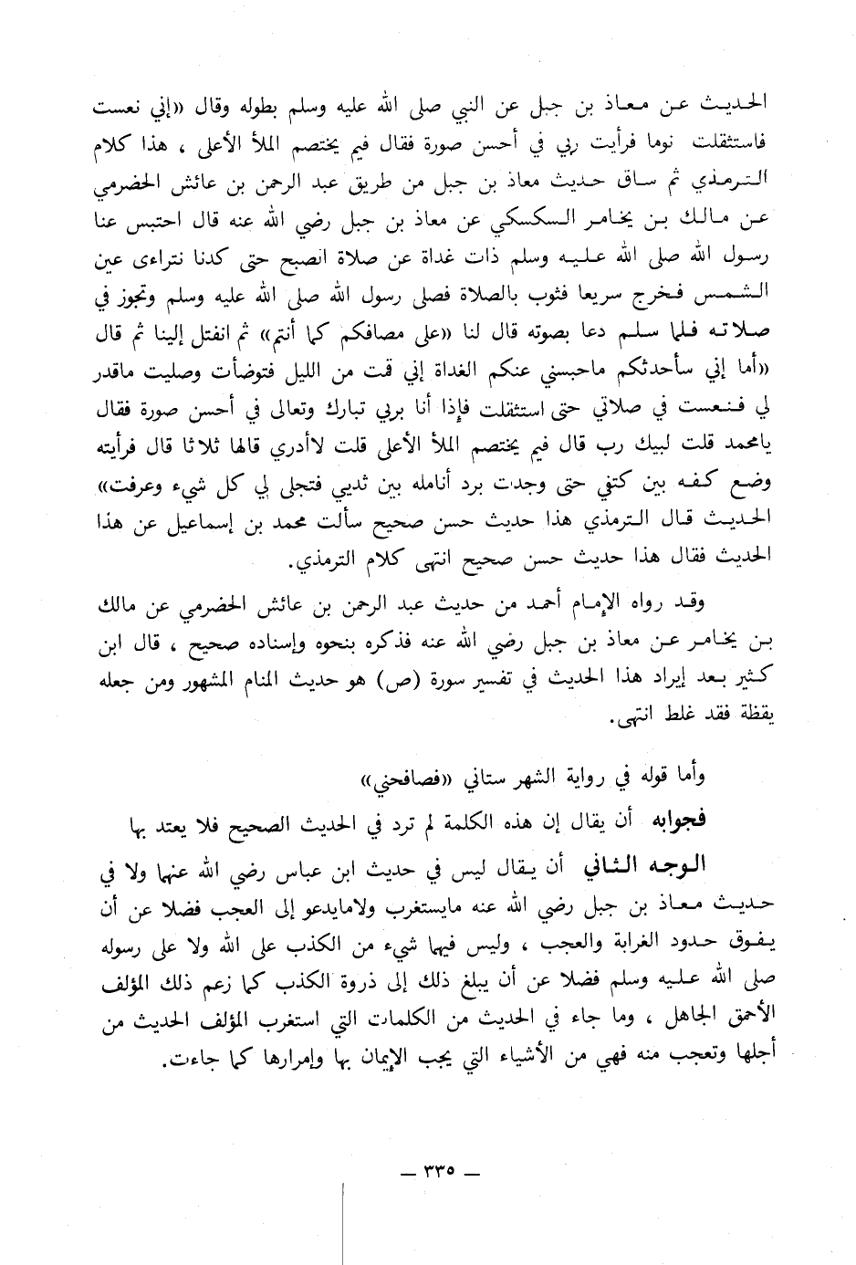 الوجه الثاني أن يقال ليس في حديث ابن عباس رضي الله عنهما ولا في حديث معاذ بن جبل رضي الله عنه ما يستغرب ولا ما يدعو إلى العجب فضلا عن أن يفوق حدود الغرابة والعجب, وليس فيهما شيء من الكذب على الله ولا على رسوله صلى الله عليه وسلم فضلا عن أن يبلغ ذلك إلى ذروة الكذب كما زعم ذلك المؤلف الأحمق الجاهل, وما جاء في الحديث من الكلمات التي استغرب المؤلف الحديث من أجلها وتعجب منه فهي من الأشياء التي يجب الإِيمان بها وإمرارها كما جاءت.