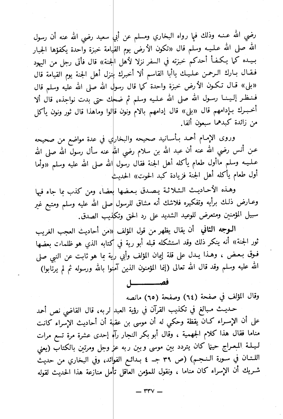 الوجه الثاني أن يقال يظهر من قول المؤلف «من أحاديث العجب الغريب ثور الجنة» أنه ينكر ذلك وقد استشكله قبله أبو رية في كتابه الذي هو ظلمات بعضها فوق بعض, وهذا يدل على قلة إيمان المؤلف وأبي رية بما هو ثابت عن النبي صلى الله عليه وسلم وقد قال الله تعالى (إنما المؤمنون الذين آمنوا بالله ورسوله ثم لم يرتابوا).
