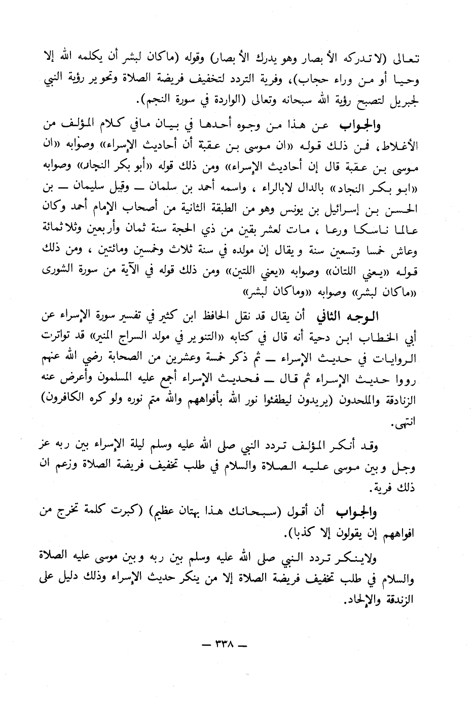 والجواب عن هذا من وجوه أحدها في بيان ما في كلام المؤلف من الأغلاط, فمن ذلك قوله (أن موسى بن عقبة أن أحاديث الإِسراء) وصوابه «أن موسى بن عقبة قال إن أحاديث الإِسراء» ومن ذلك قوله «أبو بكر النجار» وصوابه «أبو بكر النجاد» بالدال لا بالراء, واسمه أحمد بن سلمان - وقيل سليمان - بن الحسن بن إسرائيل بن يونس وهو من الطبقة الثانية من أصحاب الإِمام أحمد وكان عالما ناسكا وروعا, مات لعشر بقين من ذي الحجة سنة ثمان وأربعين وثلاثمائة وعاش خمسا وتسعين سنة ويقال إن مولده في سنة ثلاث وخمسين ومائتين, ومن ذلك قوله «يعني اللتان» وصوابه «يعني اللتين» ومن ذلك قوله في الآية من سورة الشورى «ما كان لبشر» وصوابه «وما كان لبشر».