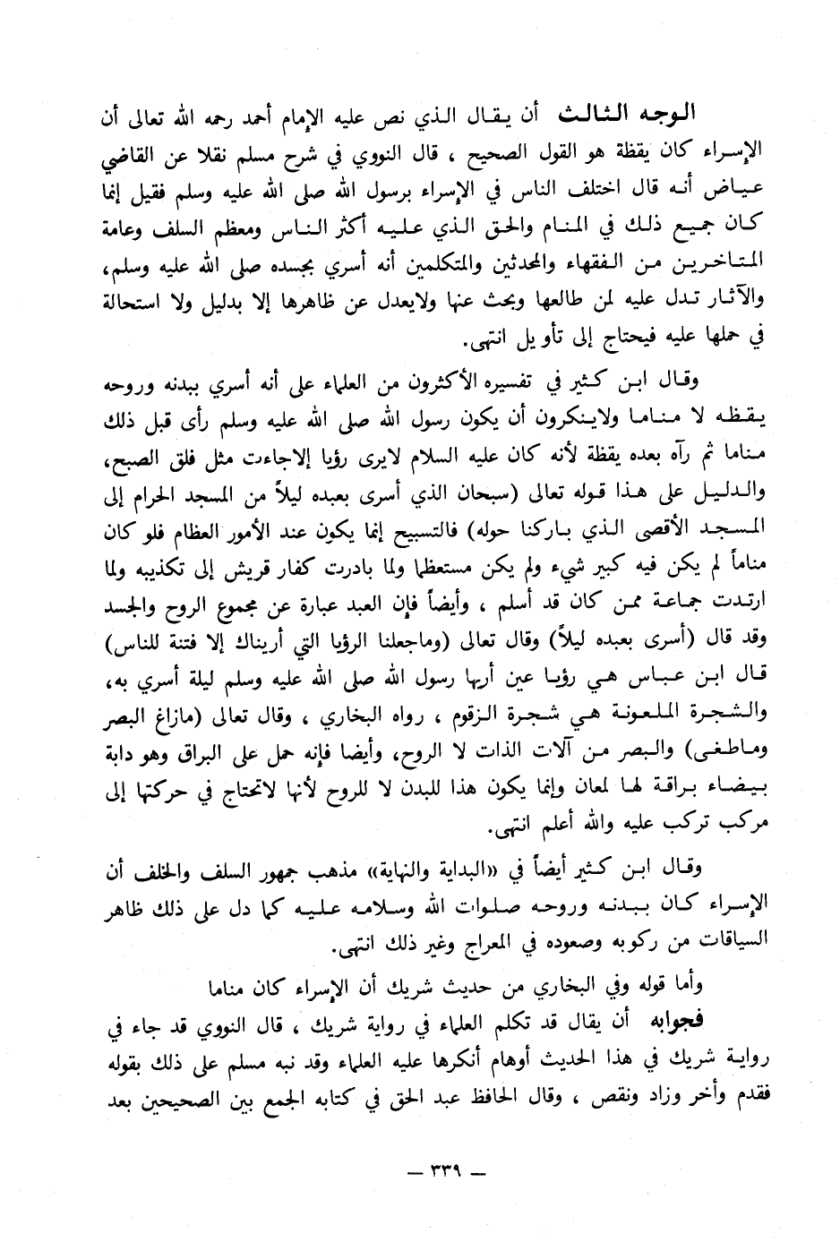 الوجه الثالث أن يقال الذي نص عليه الإِمام أحمد رحمه الله تعالى أن الإِسراء كان يقظة هو القول الصحيح, قال النووي في شرح مسلم نقلا عن القاضي عياض أنه قال اختلف الناس في الإِسراء برسول الله صلى الله عليه وسلم فقيل إنما كان جميع ذلك في المنام والحق الذي عليه أكثر الناس ومعظم السلف وعامة المتأخرين من الفقهاء والمحدثين والمتكلمين أنه أسري بجسده صلى الله عليه وسلم, والآثار تدل عليه لمن طالعها وبحث عنها ولا يعدل عن ظاهرها إلا بدليل ولا استحالة في حملها عليه فيحتاج إلى تأويل انتهى.