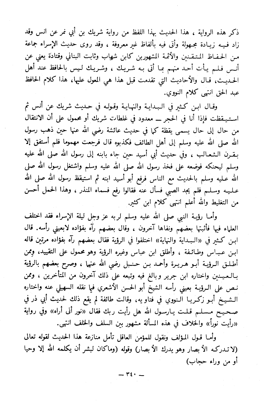 وأما رؤية النبي صلى الله عليه وسلم لربه عز وجل ليلة الإِسراء فقد اختلف العلماء فيها فأثبتها بعضهم ونفاها آخرون, وقال بعضهم رآه بفؤاده لا بعيني رأسه. قال ابن كثير في «البداية والنهاية» اختلفوا في الرؤية فقال بعضهم رآه بفؤاده مرتين قاله ابن عباس وطائفة, وأطلق ابن عباس وغيره الرؤية وهو محمول على التقييد, وممن أطلق الرؤية أبو هريرة وأحمد بن حنبل رضي الله عنهما, وصرح بعضهم بالرؤية بالعينين واختاره ابن جرير وبالغ فيه وتبعه على ذلك آخرون من المتأخرين, وممن نص على الرؤية بعيني رأسه الشيخ أبو الحسن الأشعري فيما نقله السهيلي عنه واختاره الشيخ أبو زكريا النووي في فتاويه, وقالت طائفة لم يقع ذلك لحديث أبي ذر في صحيح مسلم قلت يا رسول الله هل رأيت ربك فقال «نور أنى أراه» وفي رواية «رأيت نوراً» والخلاف في هذه المسألة مشهور بين السلف والخلف انتهى.