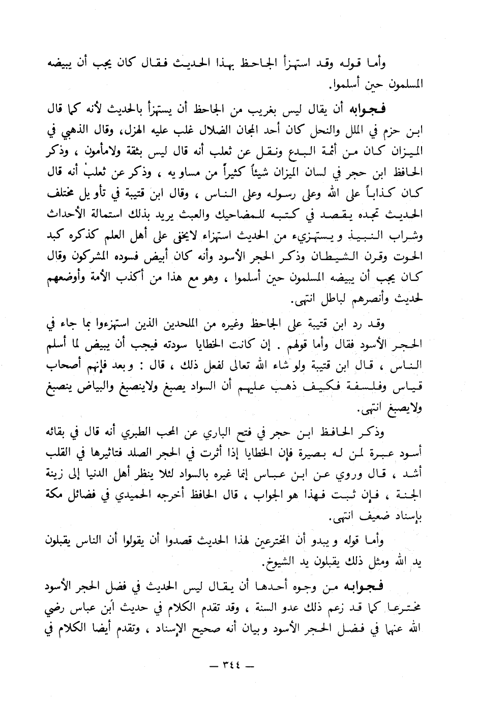 فجوابه أن يقال ليس بغريب من الجاحظ أن يستهزأ بالحديث لأنه كما قال ابن حزم في الملل والنحل كان أحد المجان الضلال غلب عليه الهزل, وقال الذهبي في الميزان كان من أئمة البدع ونقل عن ثعلب أنه قال ليس بثقة ولا مأمون, وذكر الحافظ ابن حجر في لسان الميزان شيئاً كثيراً من مساويه, وذكر عن ثعلب أنه قال كان كذاباً على الله وعلى رسوله وعلى الناس, وقال ابن قتيبة في تأويل مختلف الحديث تجده يقصد في كتبه للمضاحيك والعبث يريد بذلك استمالة الأحداث وشراب النبيذ ويستهزئ من الحديث استهزاء لا يخفى على أهل العلم كذكره كبد الحوت وقرن الشيطان وذكر الحجر الأسود وأنه كان أبيض فسوده المشركون وقال كان يجب أن يبيضه المسلمون حين أسلموا, وهو مع هذا من أكذب الأمة وأوضعهم لحديث وأنصرهم لباطل انتهى.