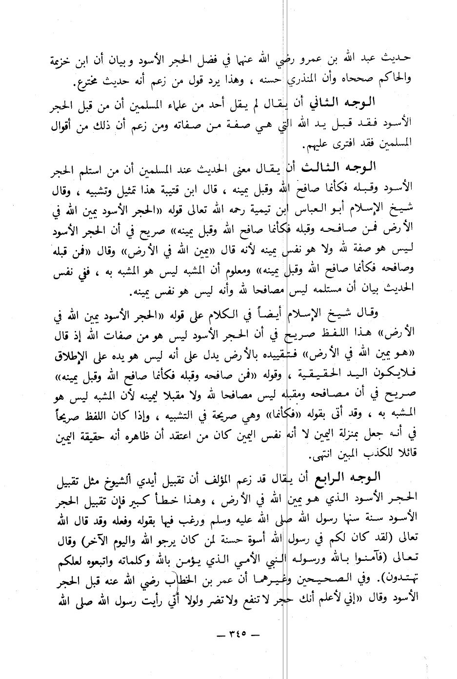 وقال شيخ الإِسلام أيضاً في الكلام على قوله «الحجر الأسود يمين الله في الأرض» هذا اللفظ صريح في أن الحجر الأسود ليس هو من صفات الله إذ قال «هو يمين الله في الأرض» فتقييده بالأرض يدل على أنه ليس هو يده على الإِطلاق فلا يكون اليد الحقيقية, وقوله «فمن صافحه وقبله فكأنما صافح الله وقبل يمينه» صريح في أن مصافحه ومقبله ليس مصافحا لله ولا مقبل ليمينه لأن المشبه ليس هو المشبه به, وقد أتى بقوله «فكأنما» وهي صريحة في التشبيه, وإذا كان اللفظ صريحاً في أنه جعل بمنزلة اليمين لا أنه نفس اليمين كان من اعتقد أن ظاهره أنه حقيقة اليمين قائلا للكذب المبين انتهى.
