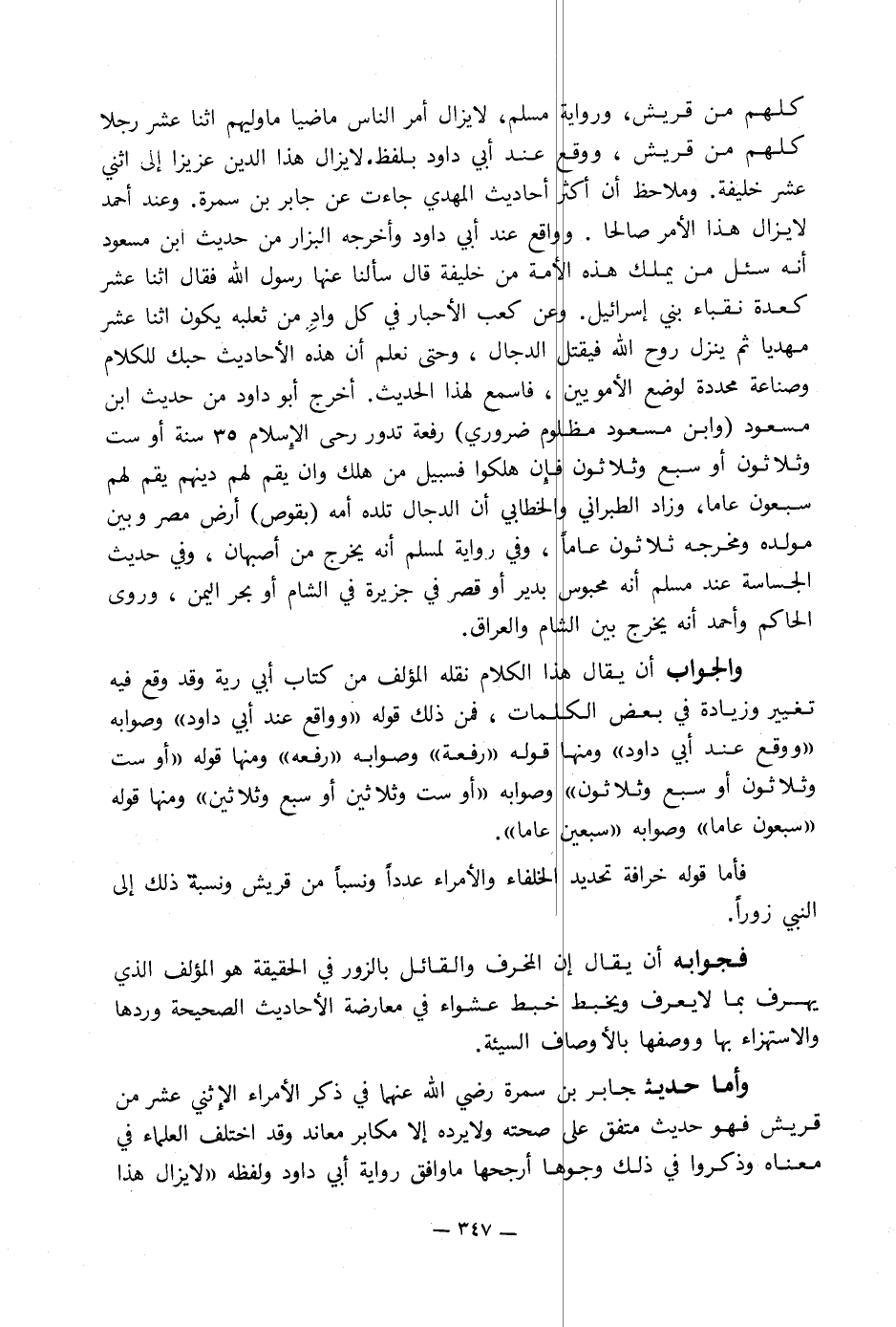 وأما حديث جابر بن سمرة رضي الله عنهما في ذكر الأمراء الاثني عشر من قريش فهو حديث متفق على صحته ولا يرده إلا مكابر معاند وقد اختلف العلماء في معناه وذكروا في ذلك وجوها أرجحها ما وافق رواية أبي داود ولفظه «لا يزال هذا