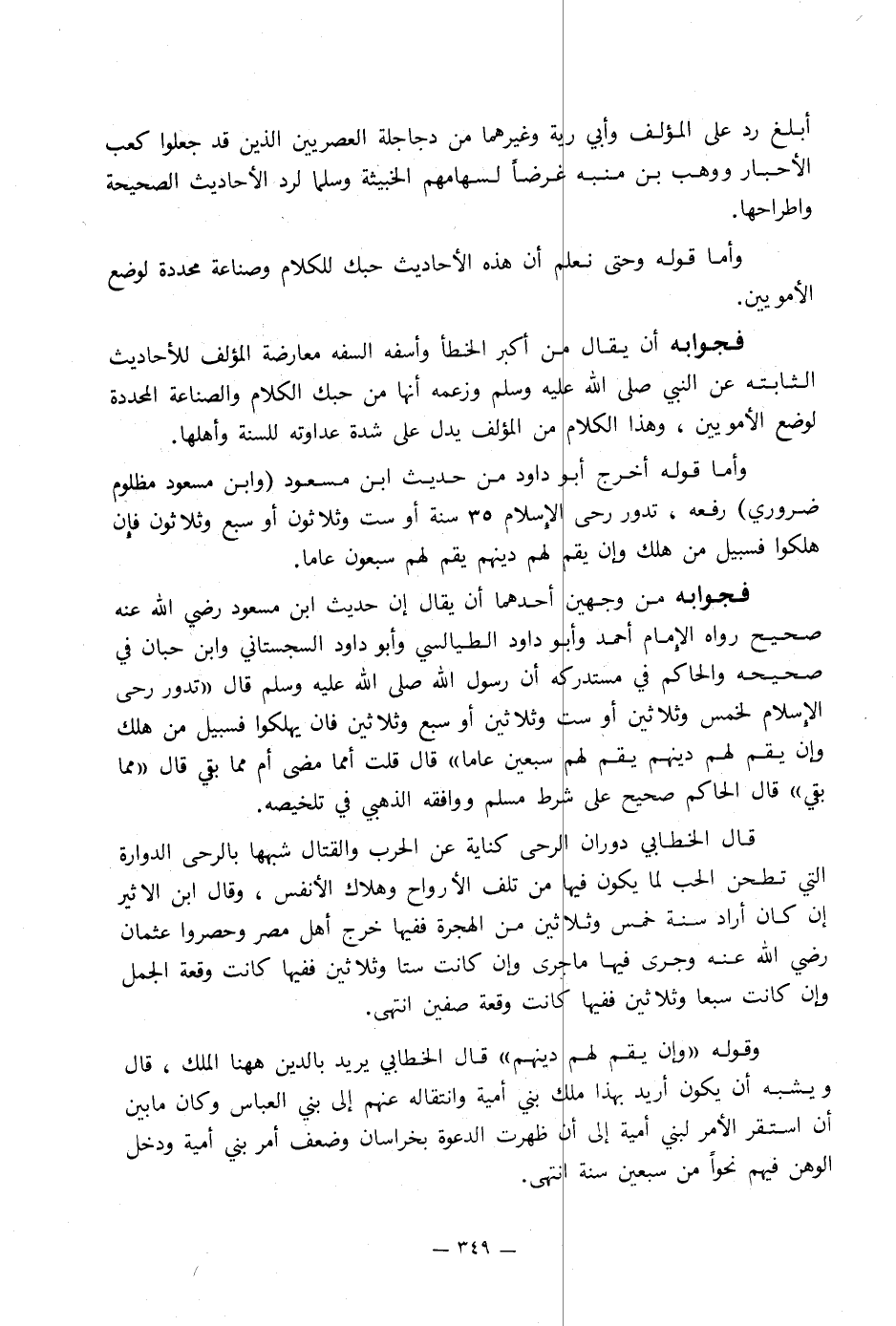 فجوابه أن يقال من أكبر الخطأ وأسفه السفه معارضة المؤلف للأحاديث الثابتة عن النبي صلى الله عليه وسلم وزعمه أنها من حبك الكلام والصناعة المحددة لوضع الأمويين, وهذا الكلام من المؤلف يدل على شدة عداوته للسنة وأهلها.