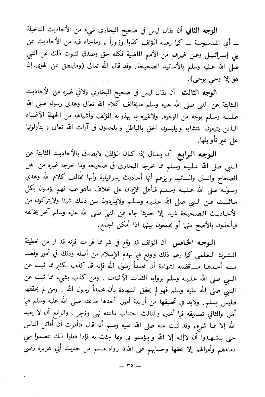 الوجه الخامس أن المؤلف قد وقع في شر مما فر منه فإِنه قد فر من خطيئة الشرك العلمي كما زعم ذلك ووقع فيما يهدم الإِسلام من أصله وذلك في أمور وقعت منه أحدها مناقضته لشهادة أن محمداً رسول الله فإِنه قد كذب بكثير مما ثبت عن النبي صلى الله عليه وسلم برواية الثقات الأثبات. ومن كذب بشيء مما ثبت عن النبي صلى الله عليه وسلم فهو لم يحقق الشهادة بأن محمداً رسول الله. ومن لم يحققها فليس بمسلم. ولا بد في تحقيقها من أربعة أمور. أحدها طاعته صلى الله عليه وسلم فيما أمر. والثاني تصديقه فيما أخبر, والثالث اجتناب ما عنه نهى وزجر. والرابع أن لا يعبد الله إلا بما شرع, وقد ثبت عنه صلى الله عليه وسلم أنه قال «أمرت أن أقاتل الناس حتى يشهدوا أن لا إله إلا الله ويؤمنوا بي وبما جئت به فإِذا فعلوا ذلك عصموا مني دماءهم وأموالهم إلا بحقها وحسابهم على الله» رواه مسلم من حديث أبي هريرة رضي