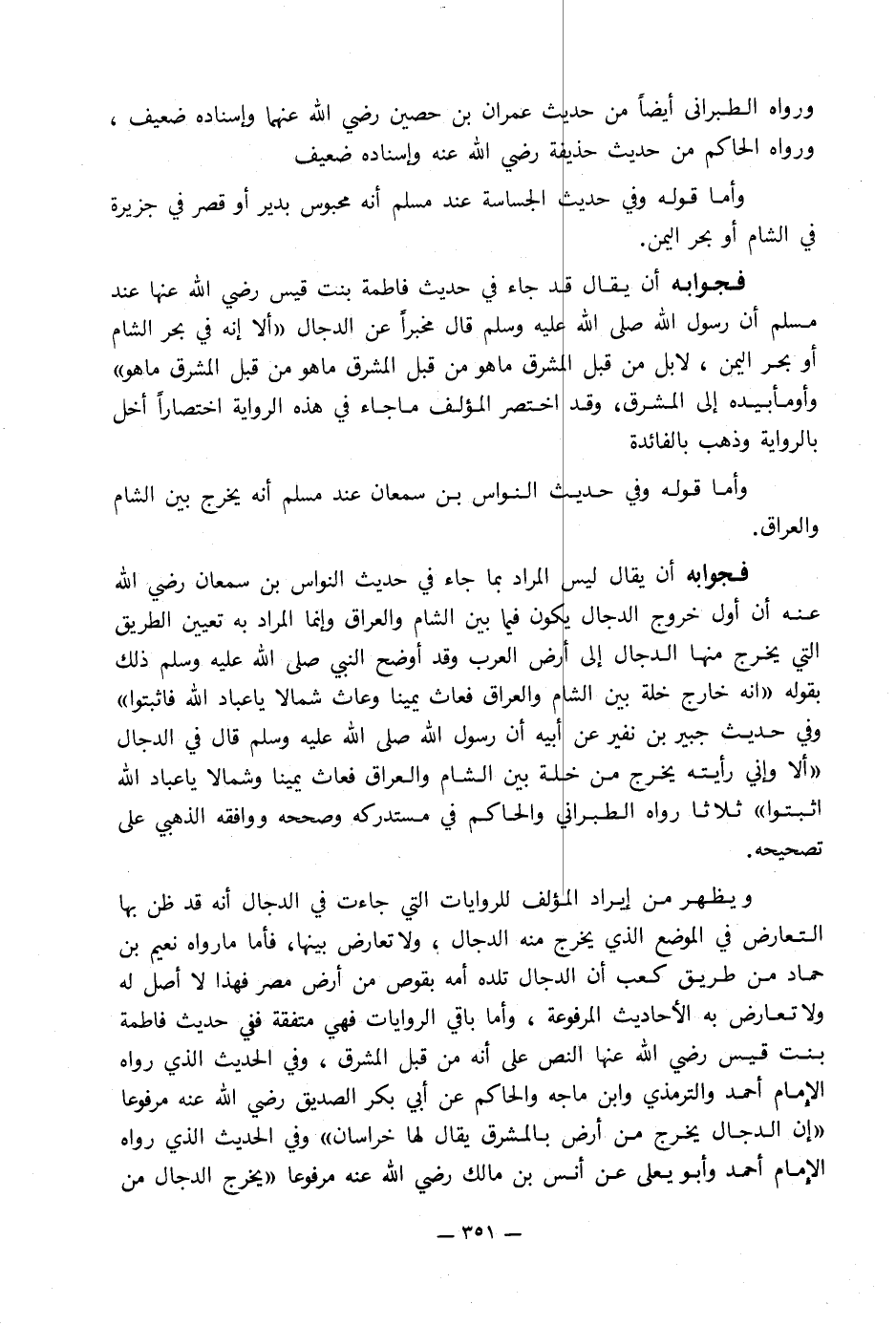 فجوابه أن يقال قد جاء في حديث فاطمة بنت قيس رضي الله عنها عند مسلم أن رسول الله صلى الله عليه وسلم قال مخبراً عن الدجال «ألا إنه في بحر الشام أو بحر اليمن, لا بل من قبل المشرق ما هو من قبل المشرق ما هو من قبل المشرق ما هو» وأومأ بيده إلى المشرق, وقد اختصر المؤلف ما جاء في هذه الرواية اختصاراً أخل بالرواية وذهب بالفائدة.