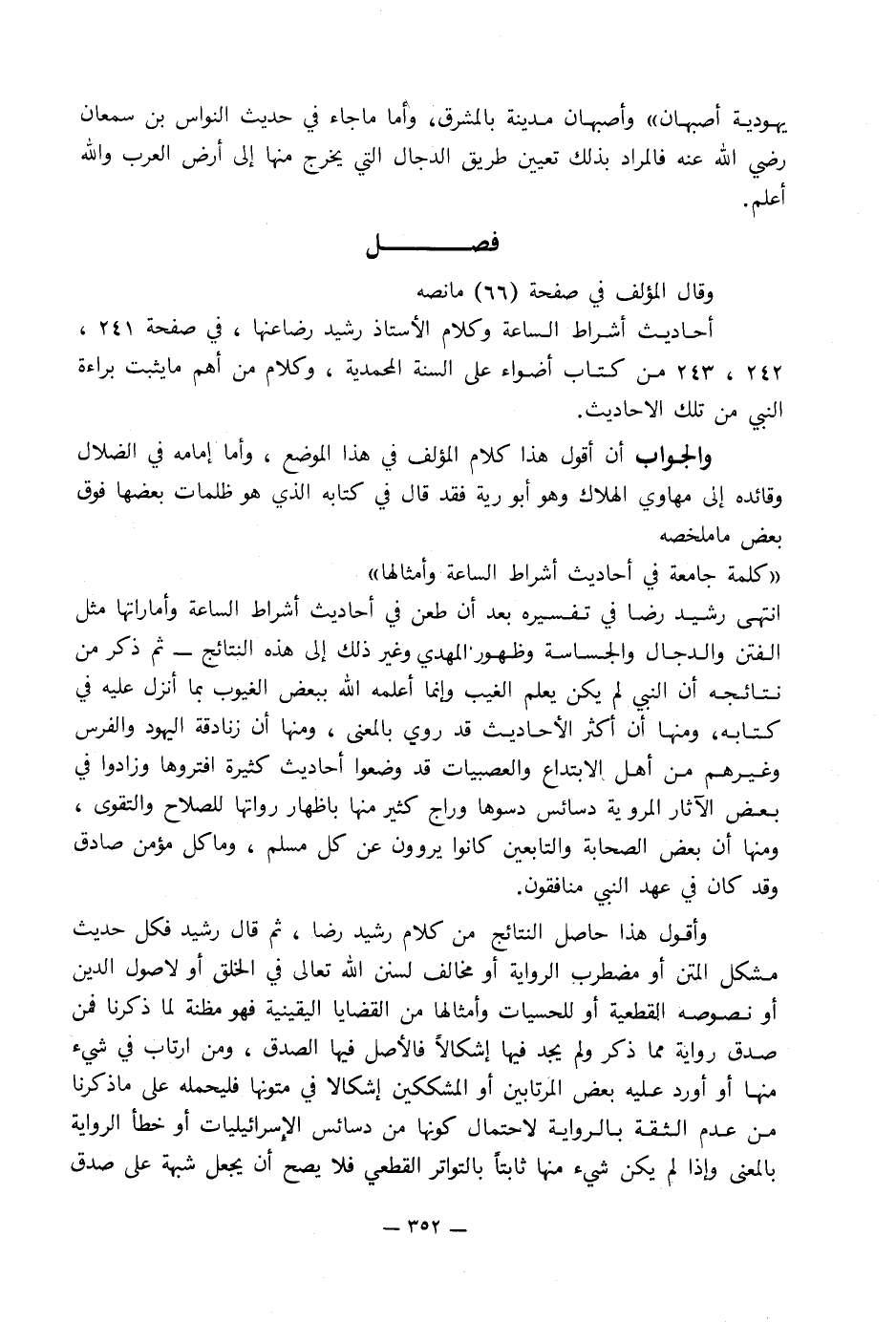 أحاديث أشراط الساعة وكلام الأستاذ رشيد رضا عنها, في صفحة 241, 242, 243 من كتاب أضواء على السنة المحمدية, وكلام من أهم ما يثبت براءة النبي من تلك الأحاديث.