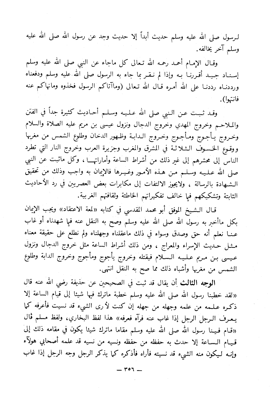 قال الشيخ الموفق أبو محمد المقدسي في كتابه «لمعة الاعتقاد» ويجب الإِيمان بكل ما أخبر به رسول الله صلى الله عليه وسلم وصح به النقل عنه فيما شهدناه أو غاب عنا نعلم أنه حق وصدق وسواء في ذلك ما عقلناه وجهلناه ولم نطلع على حقيقة معناه مثل حديث الإِسراء والمعراج, ومن ذلك أشراط الساعة مثل خروج الدجال ونزول عيسى بن مريم عليه السلام فيقتله وخروج يأجوج ومأجوج وخروج الدابة وطلوع الشمس من مغربها وأشباه ذلك مما صح به النقل انتهى.