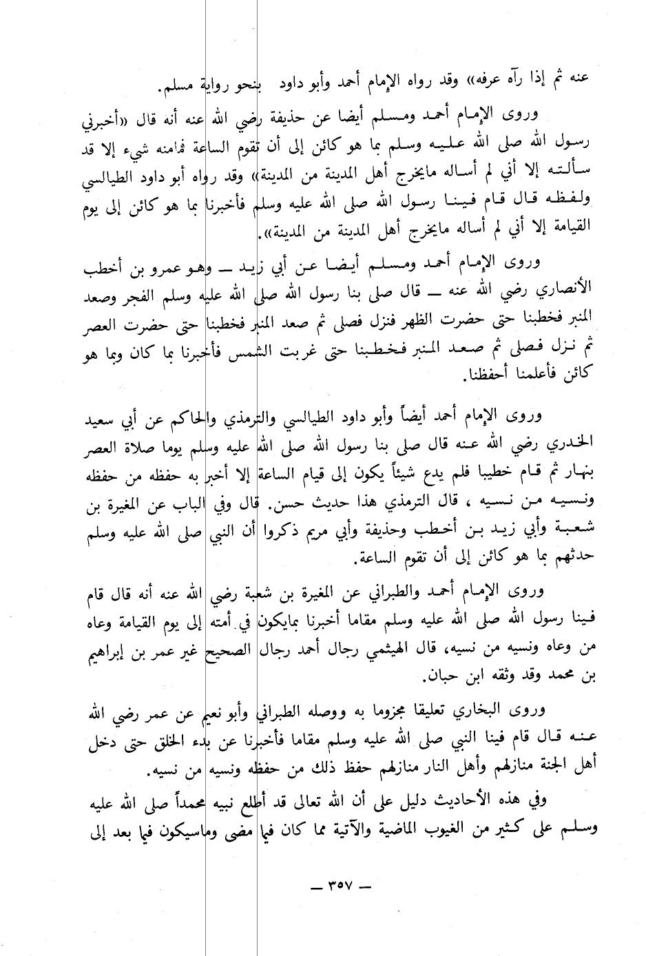 وروى الإِمام أحمد ومسلم أيضا عن حذيفة رضي الله عنه أنه قال «أخبرني رسول الله صلى الله عليه وسلم بما هو كائن إلى أن تقوم الساعة فما منه شيء إلا قد سألته إلا أني لم أسأله ما يخرج أهل المدينة من المدينة» وقد رواه أبو داود الطيالسي ولفظه قال قام فينا رسول الله صلى الله عليه وسلم فأخبرنا بما هو كائن إلى يوم القيامة إلا أني لم أسأله ما يخرج أهل المدينة من المدينة».