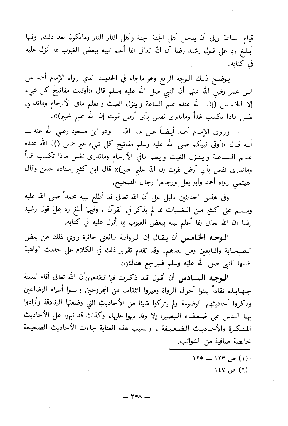 قيام الساعة وإلى أن يدخل أهل الجنة الجنة وأهل النار النار وما يكون بعد ذلك, وفيها أبلغ رد على قول رشيد رضا أن الله تعالى إنما أعلم نبيه ببعض الغيوب بما أنزل عليه في كتابه.
