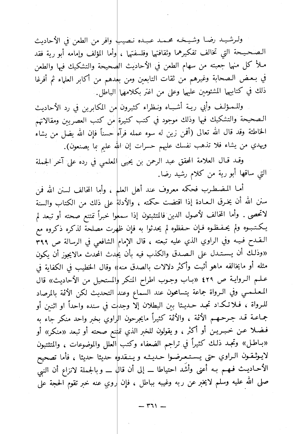 وقد قال العلامة المحقق عبد الرحمن بن يحيى المعلمي في رده على آخر الجملة التي ساقها أبو رية من كلام رشيد رضا.