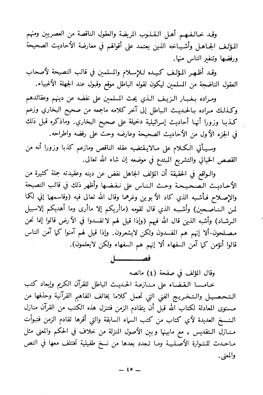 والواقع في الحقيقة أن المؤلف الجاهل نفض عن دينه وعقيدته جملة كثيرة من الأحاديث الصحيحة وحث الناس على نفضها وأظهر ذلك في قالب النصيحة والإصلاح فأشبه الذي كاد الأبوين وغرهما وقال الله تعالى فيه (وقاسمهما إني لكما لمن الناصحين) وأشبه الذي قال لقومه (ما أريكم إلا ما أرى وما أهديكم إلا سبيل الرشاد) وأشبه الذين قال الله فيهم (وإذا قيل لهم لا تفسدوا في الأرض قالوا إنما نحن مصلحون. ألا إنهم هم المفسدون ولكن لا يشعرون. وإذا قيل لهم آمنوا كما آمن الناس قالوا أنؤمن كما آمن السفهاء ألا إنهم هم السفهاء ولكن لا يعلمون).