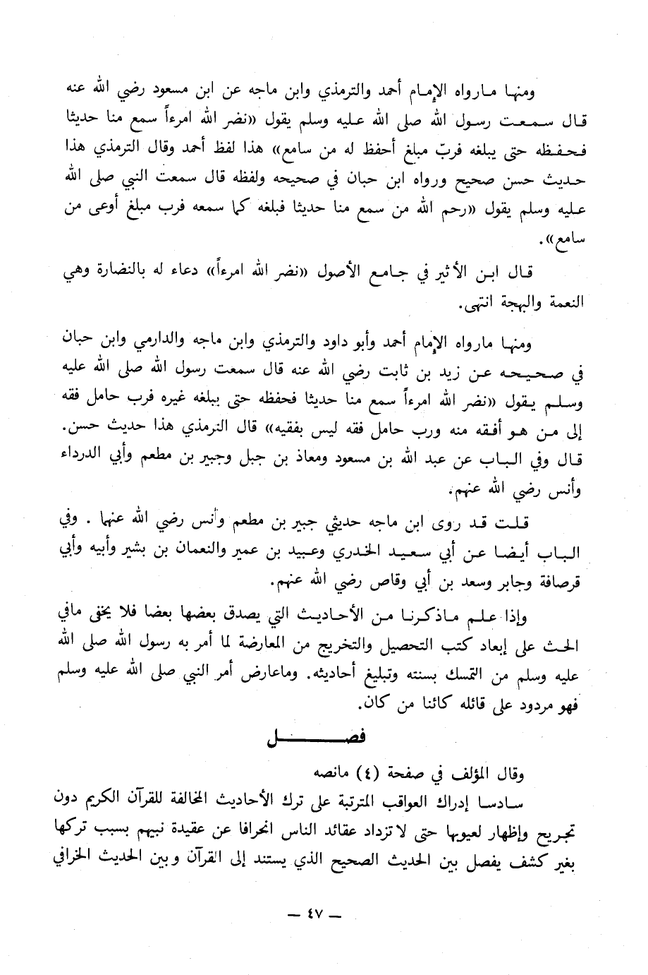 ومنها ما رواه الإِمام أحمد والترمذي وابن ماجه عن ابن مسعود رضي الله عنه قال سمعت رسول الله صلى الله عليه وسلم يقول «نضر الله امرءاً سمع منا حديثا فحفظه حتى يبلغه فربّ مبلغ أحفظ له من سامع» هذا لفظ أحمد وقال الترمذي هذا حديث حسن صحيح ورواه ابن حبان في صحيحه ولفظه قال سمعت النبي صلى الله عليه وسلم يقول «رحم الله من سمع منا حديثا فبلغه كما سمعه فرب مبلغ أوعى من سامع».