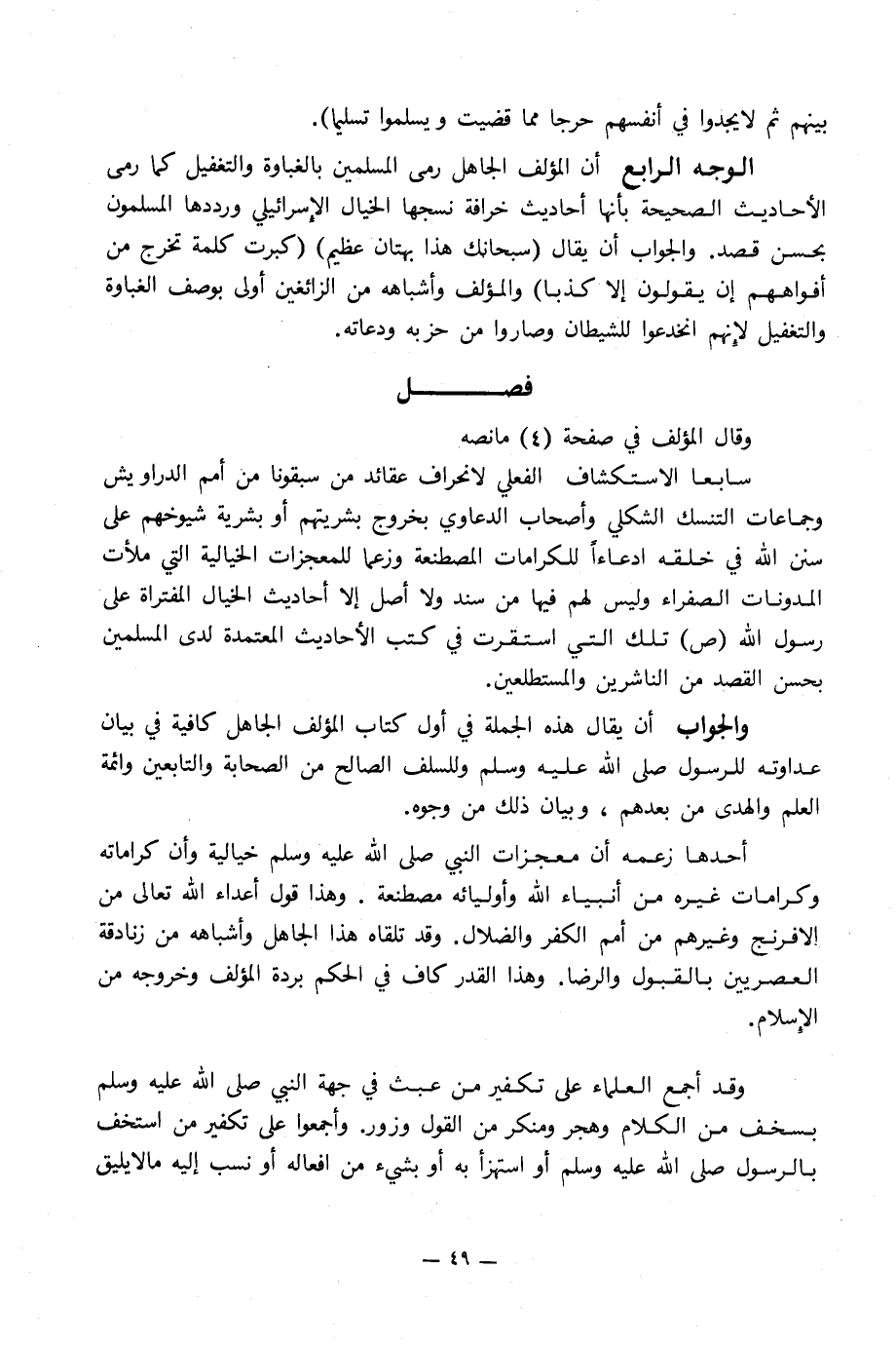 الوجه الرابع أن المؤلف الجاهل رمى المسلمين بالغباوة والتغفيل كما رمى الأحاديث الصحيحة بأنها أحاديث خرافة نسجها الخيال الإِسرائيلي ورددها المسلمون بحسن قصد. والجواب أن يقال (سبحانك هذا بهتان عظيم) (كبرت كلمة تخرج من أفواههم إن يقولون إلا كذبا) والمؤلف وأشباهه من الزائغين أولى بوصف الغباوة والتغفيل لأنهم انخدعوا للشيطان وصاروا من حزبه ودعاته.