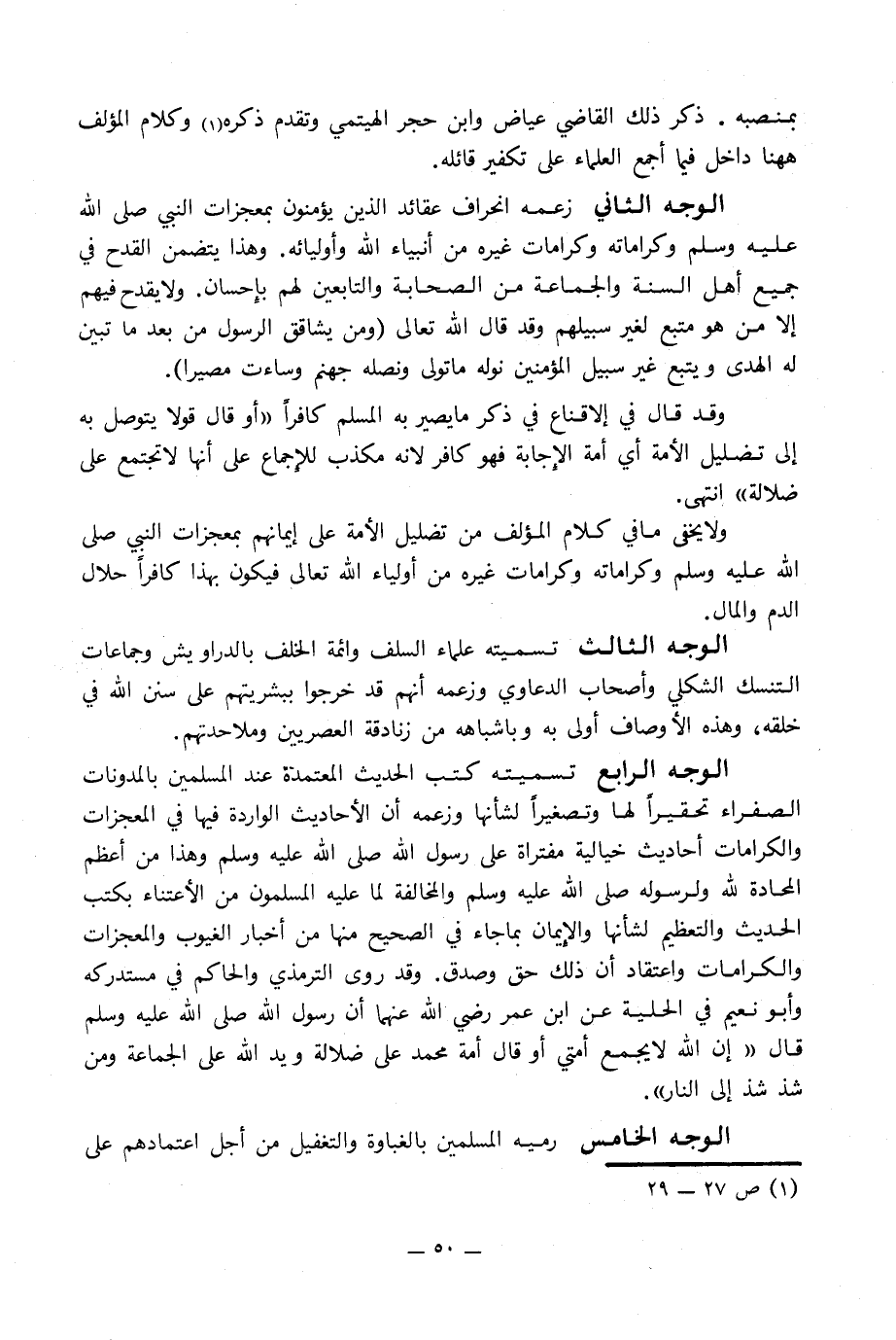 الوجه الرابع تسميته كتب الحديث المعتمدة عند المسلمين بالمدونات الصفراء تحقيراً لها وتصغيراً لشأنها وزعمه أن الأحاديث الواردة فيها في المعجزات والكرامات أحاديث خيالية مفتراة على رسول الله صلى الله عليه وسلم وهذا من أعظم المحادة لله ولرسوله صلى الله عليه وسلم والمخالفة لما عليه المسلمون من الاعتناء بكتب الحديث والتعظيم لشأنها والإِيمان بما جاء في الصحيح منها من أخبار الغيوب والمعجزات والكرامات واعتقاد أن ذلك حق وصدق. وقد روى الترمذي والحاكم في مستدركه وأبو نعيم في الحلية عن ابن عمر رضي الله عنهما أن رسول الله صلى الله عليه وسلم قال «إن الله لا يجمع أمتي أو قال أمة محمد على ضلالة ويد الله على الجماعة ومن شذ شذ إلى النار».