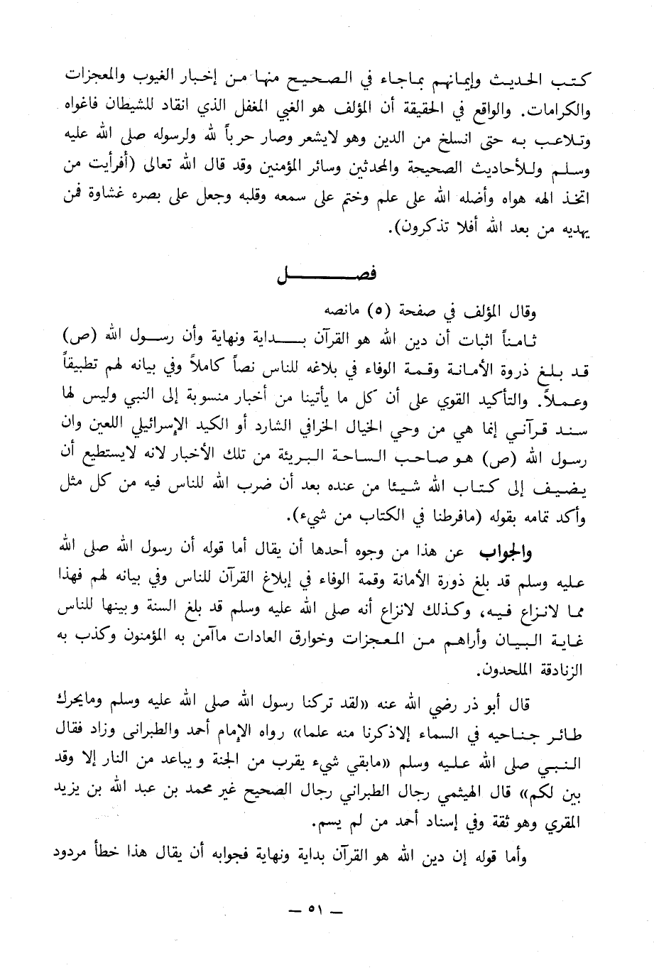 كتب الحديث وإيمانهم بما جاء في الصحيح منها من إخبار الغيوب والمعجزات والكرامات. والواقع في الحقيقة أن المؤلف هو الغبي المغفل الذي انقاد للشيطان فأغواه وتلاعب به حتى انسلخ من الدين وهو لا يشعر وصار حرباً لله ولرسوله صلى الله عليه وسلم وللأحاديث الصحيحة والمحدثين وسائر المؤمنين وقد قال الله تعالى (أفرأيت من اتخذ إلهه هواه وأضله الله على علم وختم على سمعه وقلبه وجعل على بصره غشاوة فمن يهديه من بعد الله أفلا تذكرون).