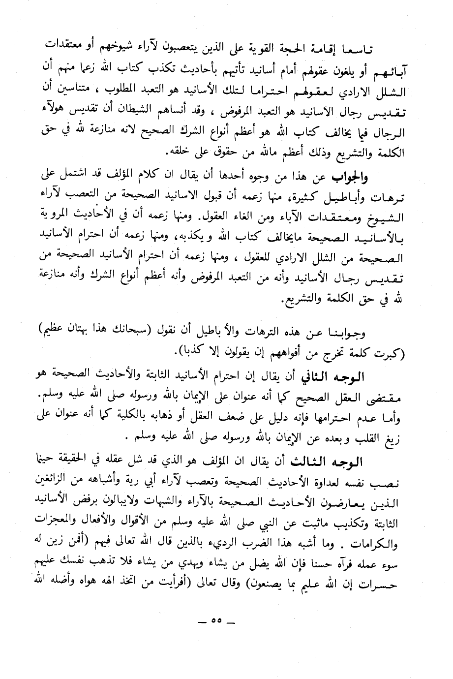 والجواب عن هذا من وجوه أحدها أن يقال أن كلام المؤلف قد اشتمل على ترهات وأباطيل كثيرة, منها زعمه أن قبول الأسانيد الصحيحة من التعصب لآراء الشيوخ ومعتقدات الآباء ومن إلغاء العقول. ومنها زعمه أن في الأحاديث المروية بالأسانيد الصحيحة ما يخالف كتاب الله ويكذبه, ومنها زعمه أن احترام الأسانيد الصحيحة من الشلل الإرادي للعقول, ومنها زعمه أن احترام الأسانيد الصحيحة من تقديس رجال الأسانيد وأنه من التعبد المرفوض وأنه أعظم أنواع الشرك وأنه منازعة لله في حق الكلمة والتشريع.