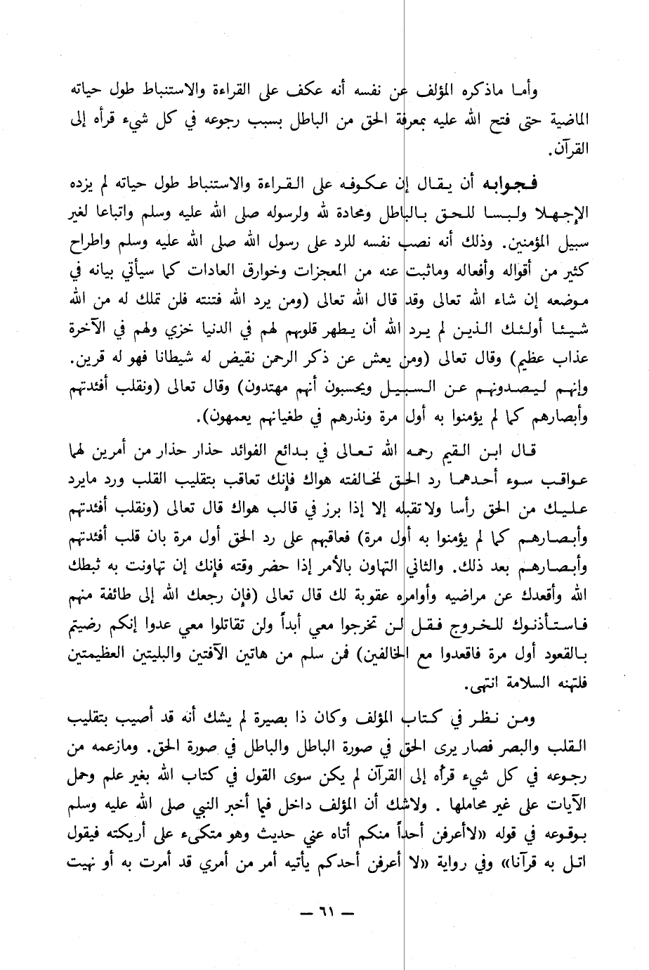 ومن نظر في كتاب المؤلف وكان ذا بصيرة لم يشك أنه قد أصيب بتقليب القلب والبصر فصار يرى الحق في صورة الباطل والباطل في صورة الحق. وما زعمه من رجوعه في كل شيء قرأه إلى القرآن لم يكن سوى القول في كتاب الله بغير علم وحمل الآيات على غير محاملها. ولا شك أن المؤلف داخل فيما أخبر النبي صلى الله عليه وسلم بوقوعه في قوله «لا أعرفن أحداً منكم أتاه عني حديث وهو متكئ على أريكته فيقول اتل به قرآنا» وفي رواية «لا أعرفن أحدكم يأتيه أمر من أمري قد أمرت به أو نهيت