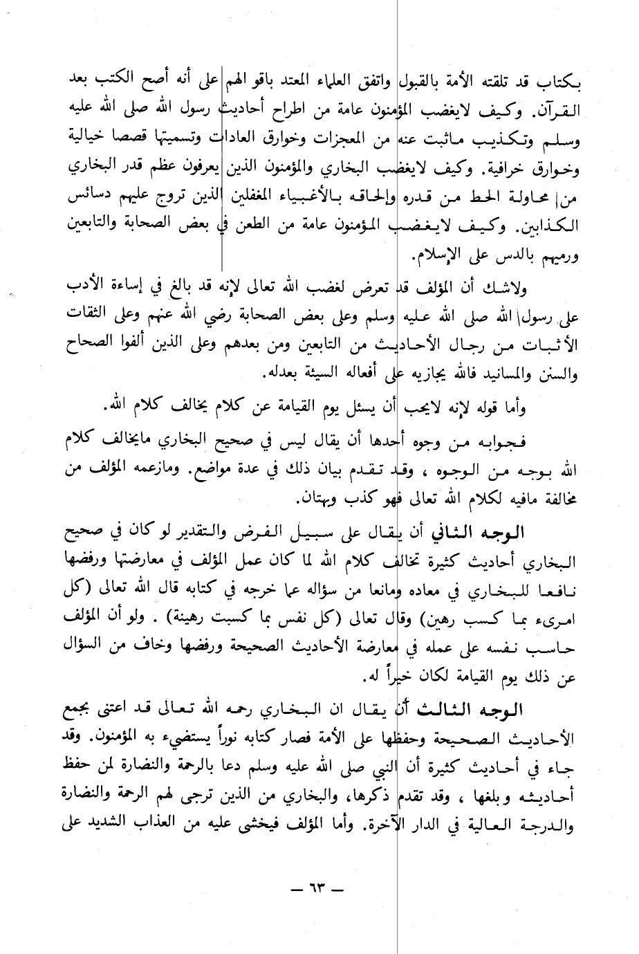 بكتاب قد تلقته الأمة بالقبول واتفق العلماء المعتد بأقوالهم على أنه أصح الكتب بعد القرآن. وكيف لا يغضب المؤمنون عامة من اطراح أحاديث رسول الله صلى الله عليه وسلم وتكذيب ما ثبت عنه من المعجزات وخوارق العادات وتسميتها قصصا خيالية وخوارق خرافية. وكيف لا يغضب البخاري والمؤمنون الذين يعرفون عظم قدر البخاري من محاولة الحط من قدره وإلحاقه بالأغبياء المغفلين الذين تروج عليهم دسائس الكذابين. وكيف لا يغضب المؤمنون عامة من الطعن في بعض الصحابة والتابعين ورميهم بالدس على الإسلام.
