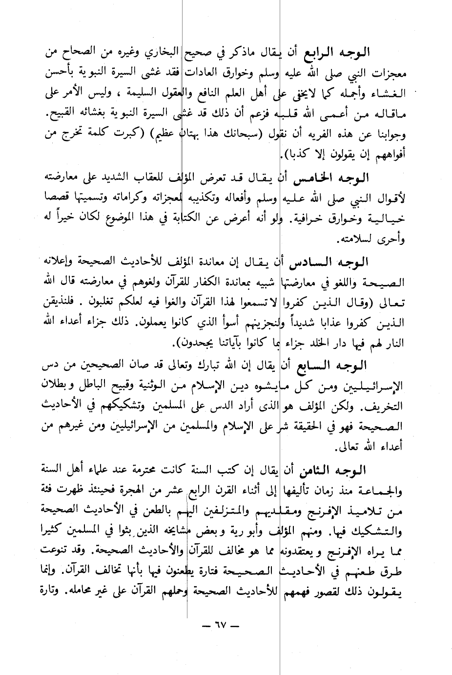 الوجه الخامس أن يقال قد تعرض المؤلف للعقاب الشديد على معارضته لأقوال النبي صلى الله عليه وسلم وأفعاله وتكذيبه لمعجزاته وكراماته وتسميتها قصصا خيالية وخوارق خرافية. ولو أنه أعرض عن الكتابة في هذا الموضوع لكان خيراً له وأحرى لسلامته.