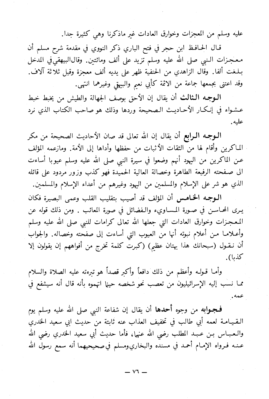 الوجه الخامس أن المؤلف قد أصيب بتقليب القلب وعمى البصيرة فكان يرى المحاسن في صورة المساوئ والفضائل في صورة المعائب. ومن ذلك قوله عن المعجزات وخوارق العادات التي جعلها الله تعالى كرامات للنبي صلى الله عليه وسلم وأعلاما من أعلام نبوته أنها من العيوب التي أساءت إلى صفحته وخصاله. والجواب أن نقول (سبحانك هذا بهتان عظيم) (كبرت كلمة تخرج من أفواههم إن يقولون إلا كذبا).
