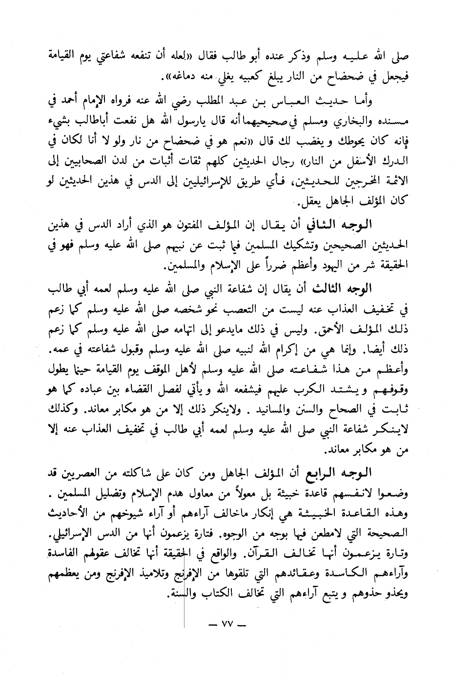 وأما حديث العباس بن عبد المطلب رضي الله عنه فرواه الإِمام أحمد في مسنده والبخاري ومسلم في صحيحيهما أنه قال يا رسول الله هل نفعت أبا طالب بشيء فإنه كان يحوطك ويغضب لك قال «نعم هو في ضحضاح من نار ولولا أنا لكان في الدرك الأسفل من النار» رجال الحديثين كلهم ثقات أثبات من لدن الصحابيين إلى الأئمة المخرجين للحديثين, فأي طريق للإِسرائيليين إلى الدس في هذين الحديثين لو كان المؤلف الجاهل يعقل.