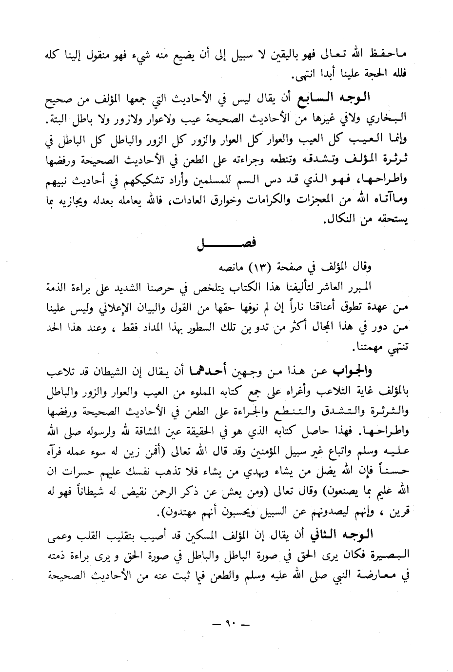 الوجه السابع أن يقال ليس في الأحاديث التي جمعها المؤلف من صحيح البخاري ولا في غيرها من الأحاديث الصحيحة عيب ولا عوار ولا زور ولا باطل البتة. وإنما العيب كل العيب والعوار كل العوار والزور كل الزور والباطل كل الباطل في ثرثرة المؤلف وتشدقه وتنطعه وجراءته على الطعن في الأحاديث الصحيحة ورفضها واطراحها, فهو الذي قد دس السم للمسلمين وأراد تشكيكهم في أحاديث نبيهم وما آتاه الله من المعجزات والكرامات وخوارق العادات, فالله يعامله بعدله ويجازيه بما يستحقه من النكال.