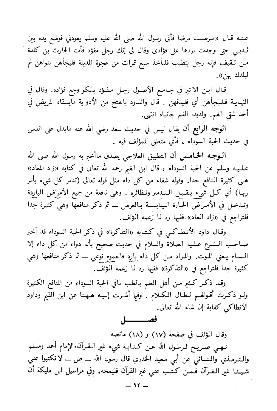 الوجه الخامس أن التطبيق العلاجي يصدق ما أخبر به رسول الله صلى الله عليه وسلم عن الحبة السوداء, قال ابن القيم رحمه الله تعالى في كتابه «زاد المعاد» هي كثيرة المنافع جدا. وقوله شفاء من كل داء مثل قوله تعالى (تدمر كل شيء بأمر ربها) أي كل شيء يقبل التدمير ونظائره. وهي نافعة من جميع الأمراض الباردة وتدخل في الأمراض الحارة اليابسة بالعرض - ثم ذكر منافعها وهي كثيرة جدا فلتراجع في «زاد المعاد» ففيها رد لما زعمه المؤلف.