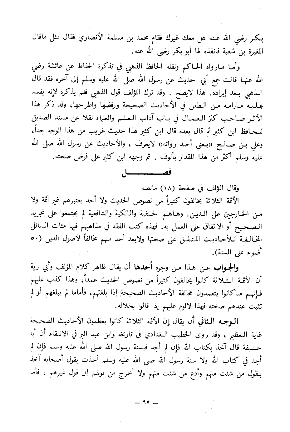 والجواب عن هذا من وجوه أحدها أن يقال ظاهر كلام المؤلف وأبي رية أن الأئمة الثلاثة كانوا يخالفون كثيراً من نصوص الحديث عمداً, وهذا كذب عليهم فإِنهم ما كانوا يتعمدون مخالفة الأحاديث الصحيحة إذا بلغتهم, فأما ما لم يبلغهم أو لم تثبت عندهم صحته فهذا لا لوم عليهم إذا قالوا بخلافه.