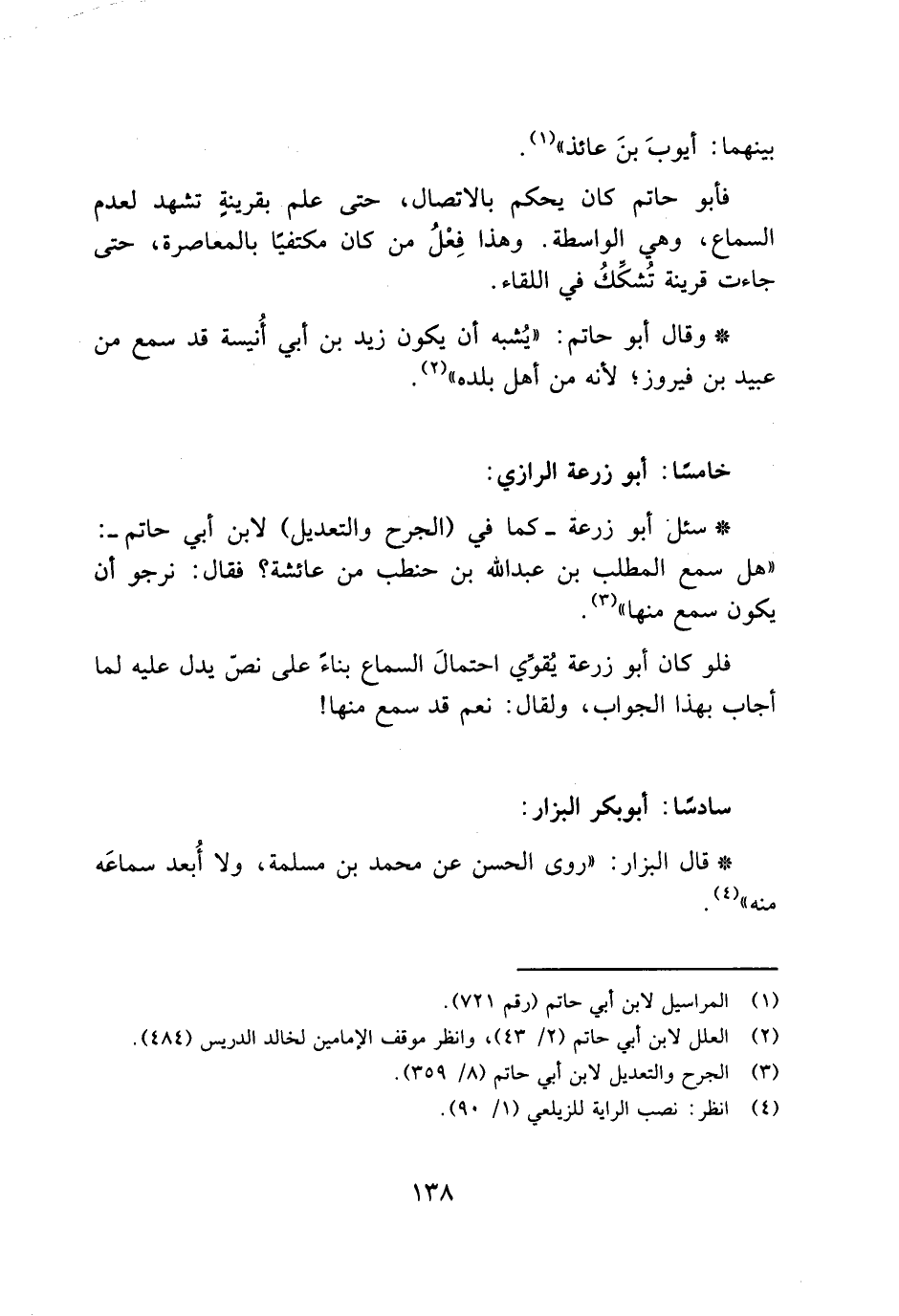 فأبو حاتم كان يحكم بالاتصال، حتى علم بقرينةٍ تشهد لعدم السماع، وهي الواسطة. وهذا فِعْلُ من كان مكتفيًا بالمعاصرة، حتى جاءت قرينة تُشكِّكُ في اللقاء.