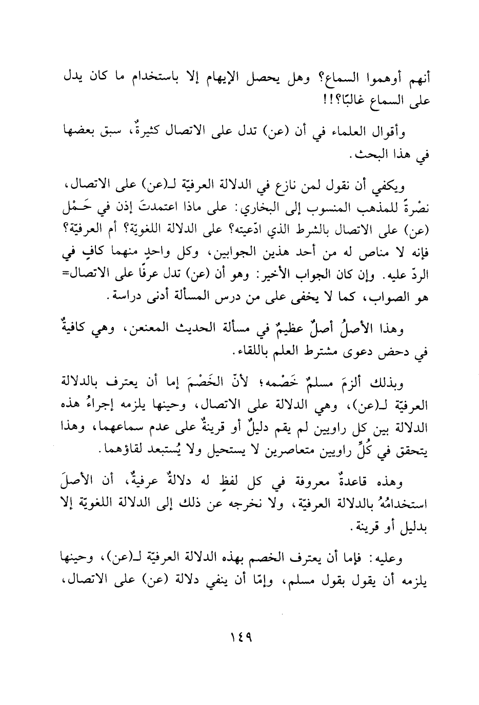 ويكفي أن نقول لمن نازع في الدلالة العرفيّة لـ (عن) على الاتصال، نصْرةً للمذهب المنسوب إلى البخاري: على ماذا اعتمدت إذن في حَمْل (عن) على الاتصال بالشرط الذي ادّعيته؟ على الدلالة اللغويّة؟ أم العرفيّة؟ فإنه لا مناص له من أحد هذين الجوابين، وكل واحدٍ منهما كافٍ في الردّ عليه. وإن كان الجواب الأخير: وهو أن (عن) تدل عرفًا على الاتصال= هو الصواب، كما لا يخفى على من درس المسألة أدنى دراسة.