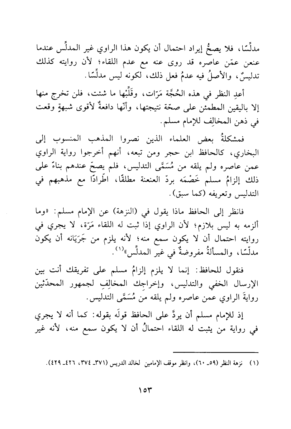 فانظر إلى الحافظ ماذا يقول في (النزهة) عن الإمام مسلم: ((وما ألزمه به ليس بلازم، لأن الراوي إذا ثبت له اللقاء مَرّة، لا يجري في روايته احتمال أن لا يكون سمع منه، لأنه يلزم من جَرَيَانه أن يكون مدلّسًا، والمسألةُ مفروضةٌ في غير المدلِّس)) (1) .