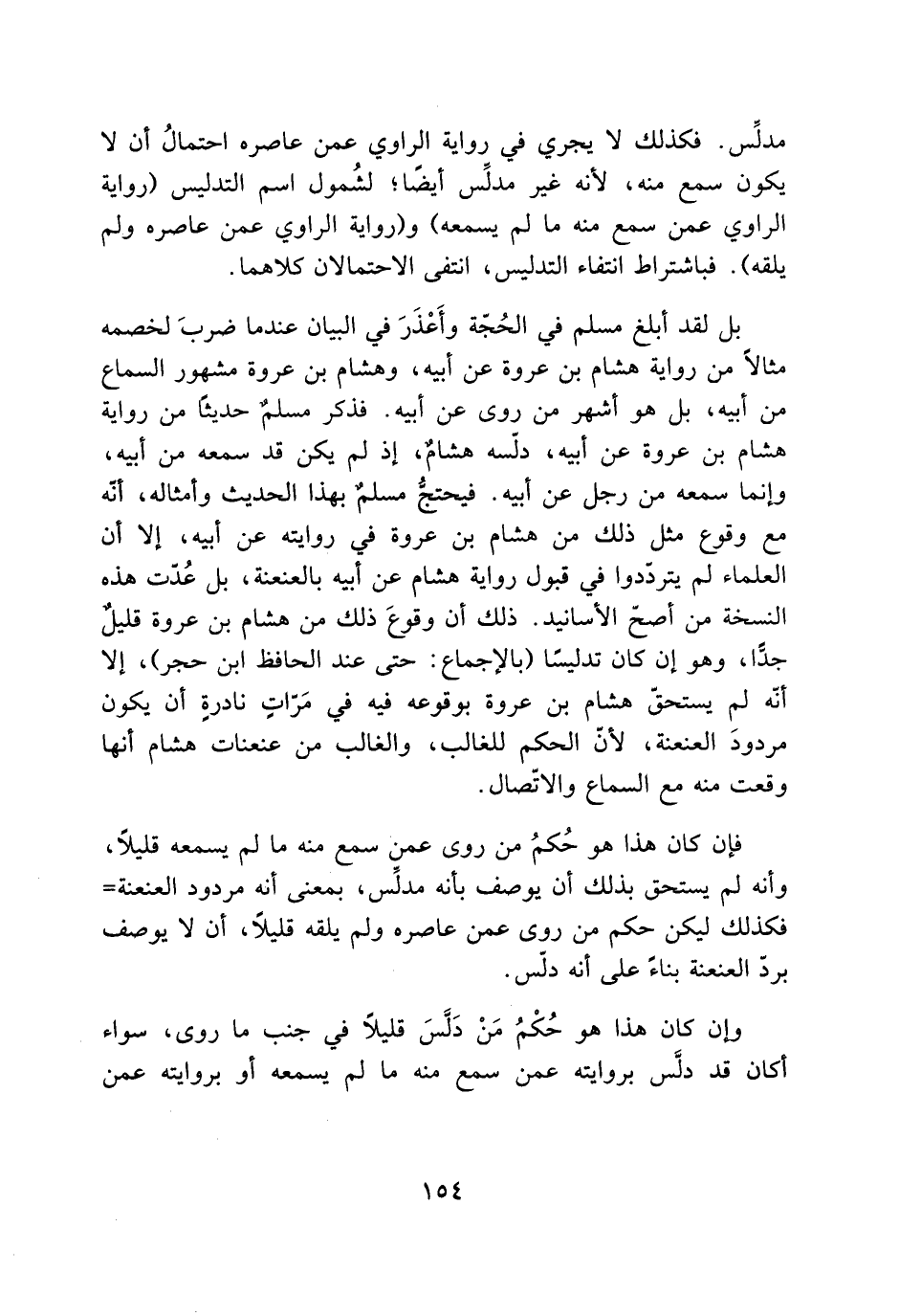 بل لقد أبلغ مسلم في الحُجّة وأَعْذَرَ في البيان عندما ضربَ لخصمه مثالاً من رواية هشام بن عروة عن أبيه، وهشام بن عروة مشهور السماع من أبيه، بل هو أشهر من روى عن أبيه. فذكر مسلمٌ حديثًا من رواية هشام بن عروة عن أبيه، دلّسه هشامٌ، إذ لم يكن قد سمعه من أبيه، وإنما سمعه من رجل عن أبيه. فيحتجُّ مسلمٌ بهذا الحديث وأمثاله، أنّه مع وقوع مثل ذلك من هشام بن عروة في روايته عن أبيه، إلا أن العلماء لم يتردّدوا في قبول رواية هشام عن أبيه بالعنعنة، بل عُدّت هذه النسخة من أصحّ الأسانيد. ذلك أن وقوعَ ذلك من هشام بن عروة قليلٌ جدًّا، وهو إن كان تدليسًا (بالإجماع: حتى عند الحافظ ابن حجر) ، إلا أنّه لم يستحقّ هشام بن عروة بوقوعه فيه في مَرّاتٍ نادرةٍ أن يكون مردودَ العنعنة، لأنّ الحكم للغالب، والغالب من عنعنات هشام أنها وقعت منه مع السماع والاتّصال.