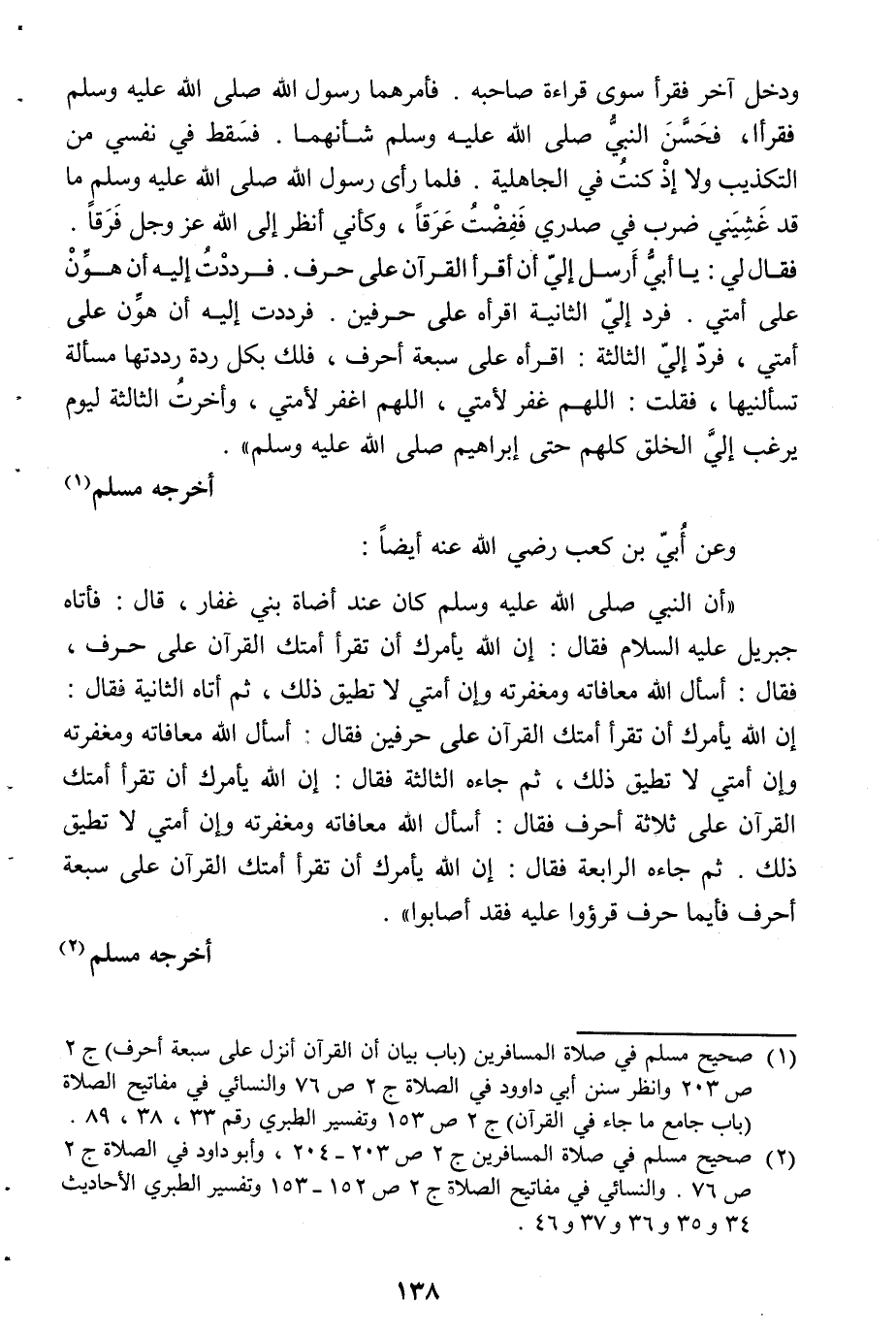 (¬1) صحيح مسلم في صلاة المسافرين (باب بيان أن القرآن أنزل على سبعة أحرف) ج 2 ص 203 وانظر سنن أبي داود في الصلاة ج 2 ص 76 والنسائي في مفاتيح الصلاة (باب جامع ما جاء في القرآن) ج 2 ص 153 وتفسير الطبري رقم 33، 38، 89.