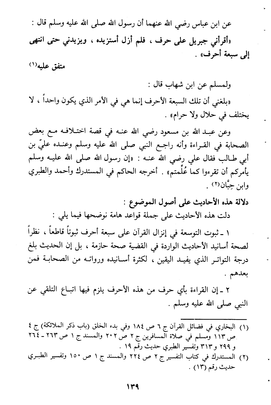 1 - ثبوت التوسعة في إنزال القرآن على سبعة أحرف ثبوتا قاطعا، نظرا لصحة أسانيد الأحاديث الواردة في القضية صحة حازمة، بل إن الحديث بلغ درجة التواتر الذي يفيد اليقين، لكثرة أسانيده ورواته من الصحابة فمن بعدهم.