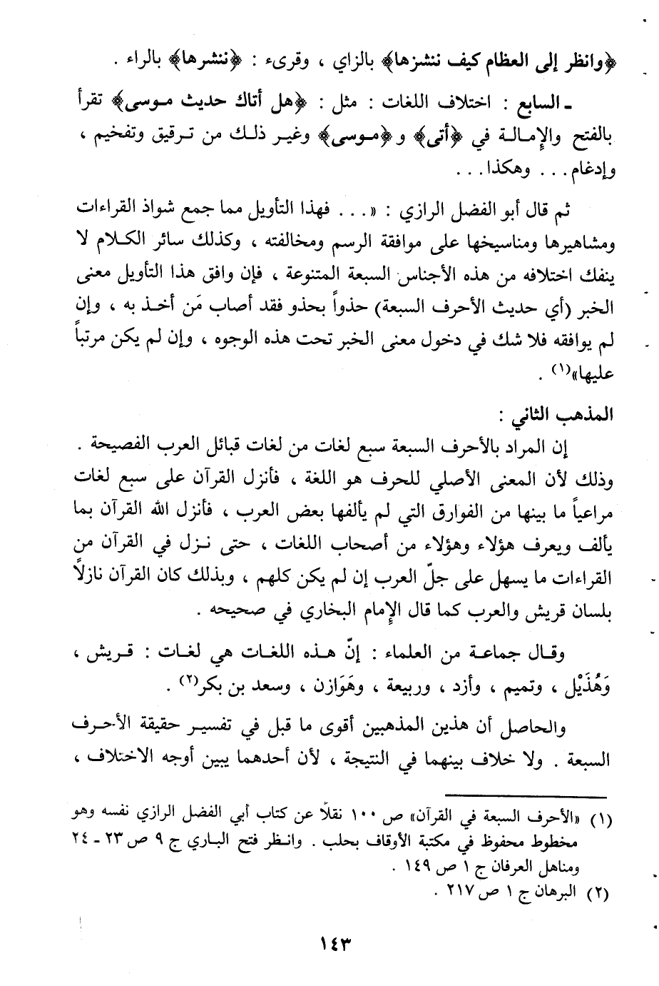 (¬1) «الأحرف السبعة في القرآن» ص 100 نقلا عن كتاب أبي الفضل الرازي نفسه وهو مخطوط محفوظ في مكتبة الأوقاف بحلب. وانظر فتح الباري ج 9 ص 23 - 24 ومناهل العرفان ج 1 ص 149.