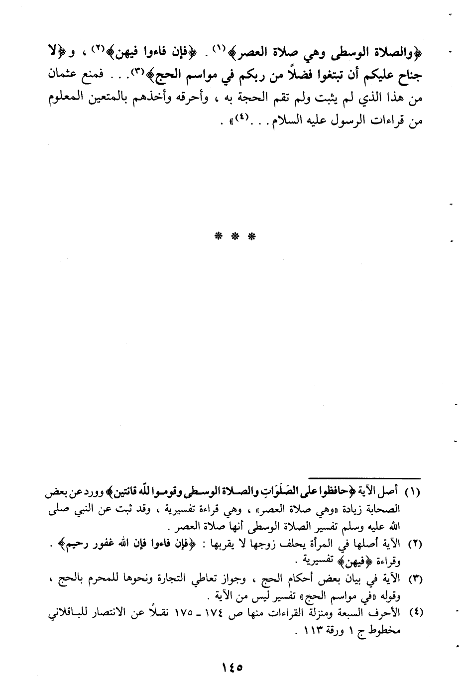 والصلاة الوسطى وهي صلاة العصر (¬1). فَإِنْ فاؤُ (¬2)، ولَيْسَ عَلَيْكُمْ جُناحٌ أَنْ تَبْتَغُوا فَضْلًا مِنْ رَبِّكُمْ في مواسم الحج (¬3) ... فمنع عثمان من هذا الذي لم يثبت ولم تقم الحجة به، وأحرقه وأخذهم بالمتعين المعلوم من قراءات الرسول عليه السلام ... (¬4)».