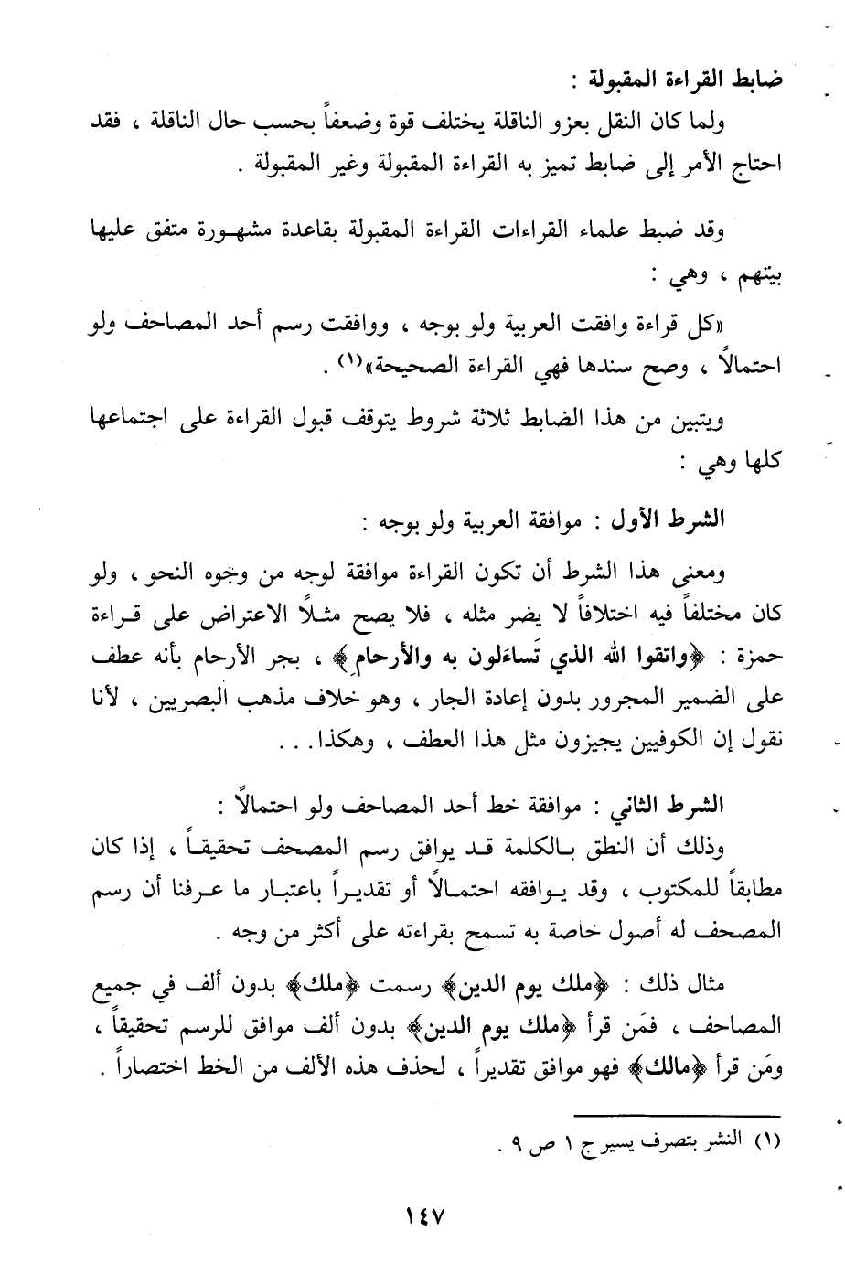 ومعنى هذا الشرط أن تكون القراءة موافقة لوجه من وجوه النحو، ولو كان مختلفا فيه اختلافا لا يضر مثله، فلا يصح مثلا الاعتراض على قراءة حمزة: وَاتَّقُوا اللَّهَ الَّذِي تَسائَلُونَ بِهِ وَالْأَرْحامَ، بجر الأرحام بأنه عطف على الضمير المجرور بدون إعادة الجار، وهو خلاف مذهب البصريين، لأنا نقول إن الكوفيين يجيزون مثل هذا العطف، وهكذا ...