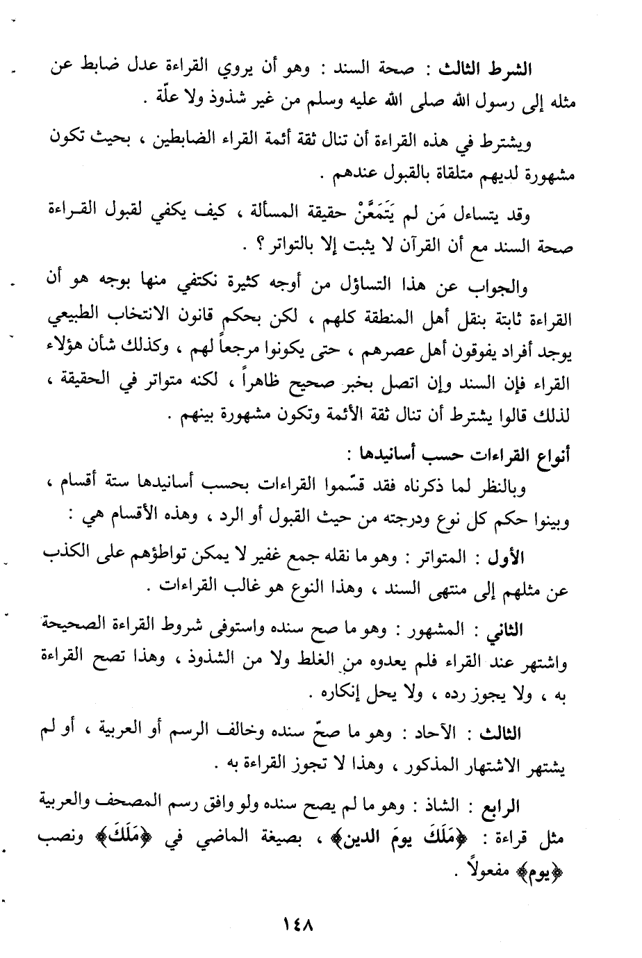 وبالنظر لما ذكرناه فقد قسّموا القراءات بحسب أسانيدها ستة أقسام، وبينوا حكم كل نوع ودرجته من حيث القبول أو الرد، وهذه الأقسام هي: