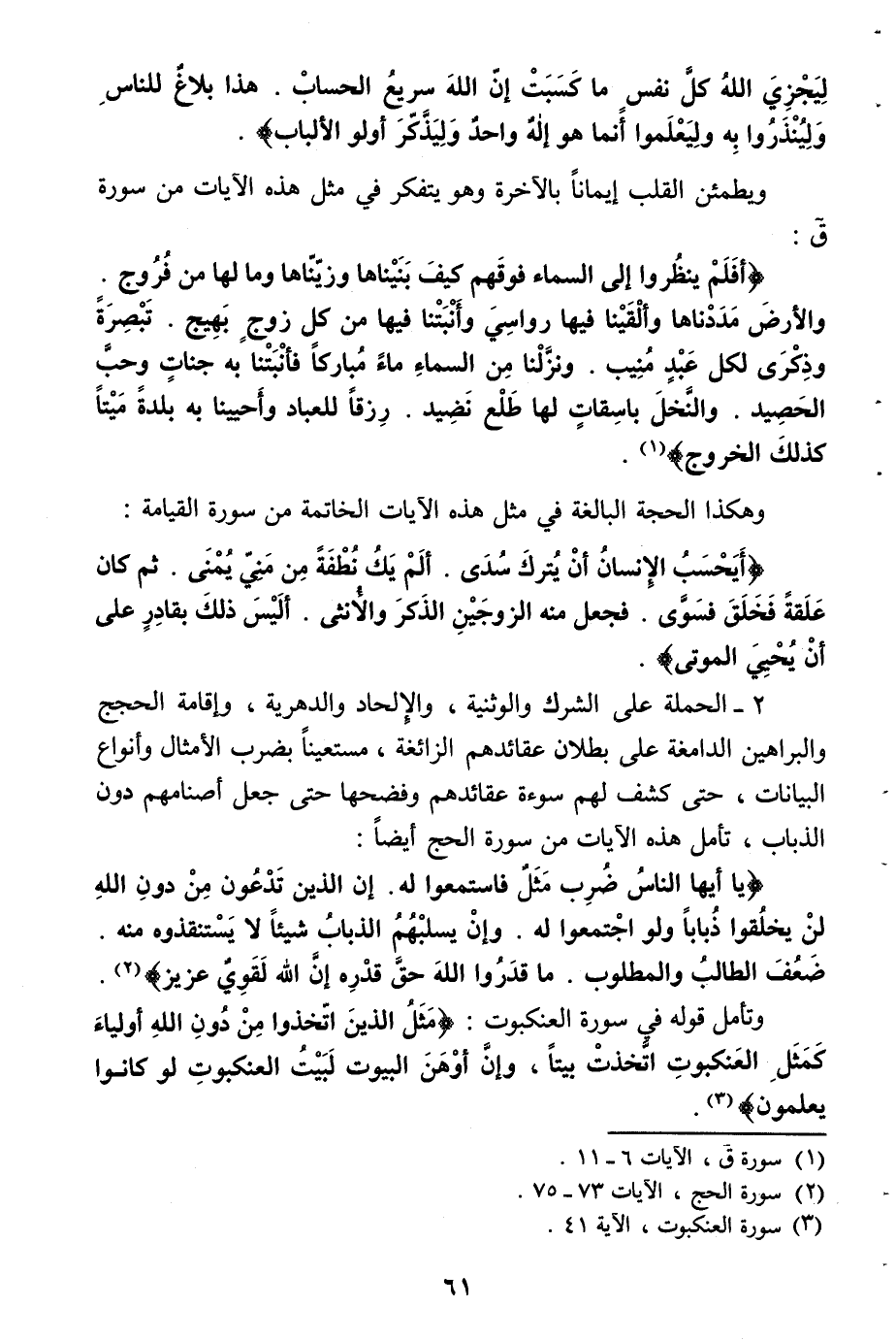 أَفَلَمْ يَنْظُرُوا إِلَى السَّماءِ فَوْقَهُمْ كَيْفَ بَنَيْناها وَزَيَّنَّاها وَما لَها مِنْ فُرُوجٍ. وَالْأَرْضَ مَدَدْناها وَأَلْقَيْنا فِيها رَواسِيَ وَأَنْبَتْنا فِيها مِنْ كُلِّ زَوْجٍ بَهِيجٍ. تَبْصِرَةً وَذِكْرى لِكُلِّ عَبْدٍ مُنِيبٍ. وَنَزَّلْنا مِنَ السَّماءِ ماءً مُبارَكاً فَأَنْبَتْنا بِهِ جَنَّاتٍ وَحَبَّ الْحَصِيدِ. وَالنَّخْلَ باسِقاتٍ لَها طَلْعٌ نَضِيدٌ. رِزْقاً لِلْعِبادِ وَأَحْيَيْنا بِهِ بَلْدَةً مَيْتاً كَذلِكَ الْخُرُوجُ (¬1).
