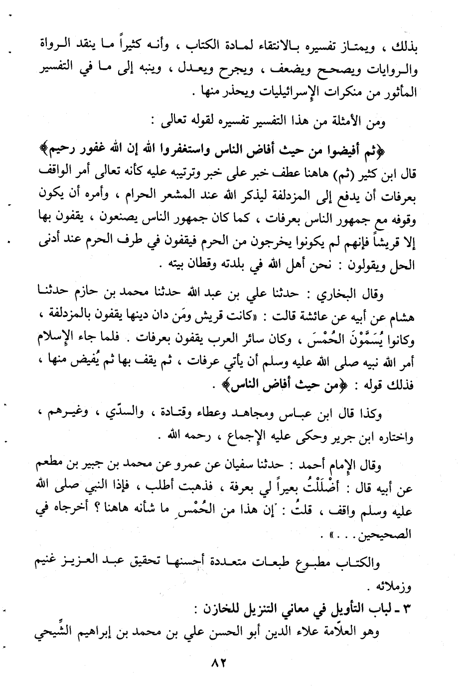 وقال البخاري: حدثنا علي بن عبد الله حدثنا محمد بن حازم حدثنا هشام عن أبيه عن عائشة قالت: «كانت قريش ومن دان دينها يقفون بالمزدلفة، وكانوا يسمّون الحمس، وكان سائر العرب يقفون بعرفات. فلما جاء الإسلام أمر الله نبيه صلى الله عليه وسلم أن يأتي عرفات، ثم يقف بها ثم يفيض منها، فذلك قوله: مِنْ حَيْثُ أَفاضَ النَّاسُ.