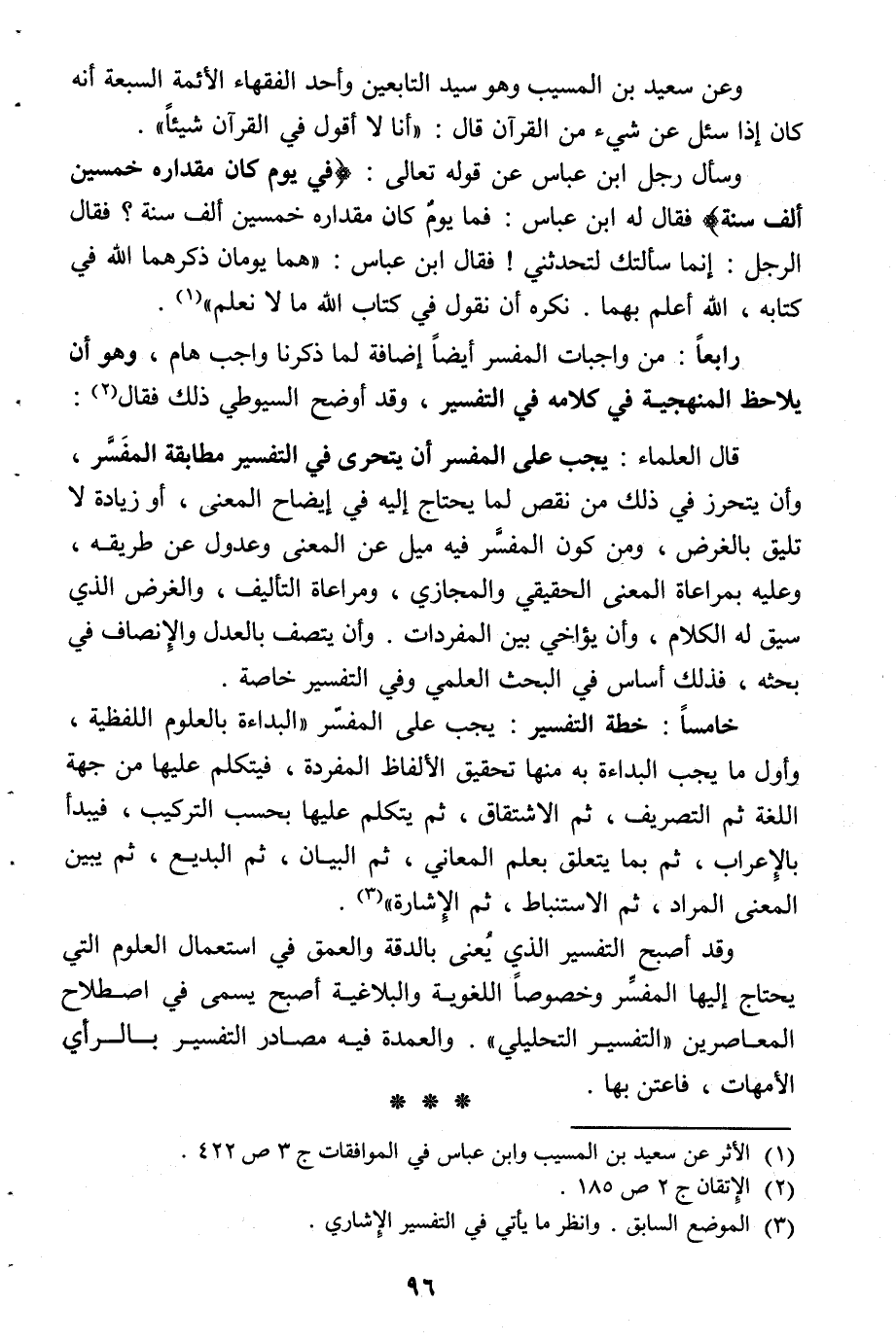 وعن سعيد بن المسيب وهو سيد التابعين وأحد الفقهاء الأئمة السبعة أنه كان إذا سئل عن شيء من القرآن قال: «أنا لا أقول في القرآن شيئا».